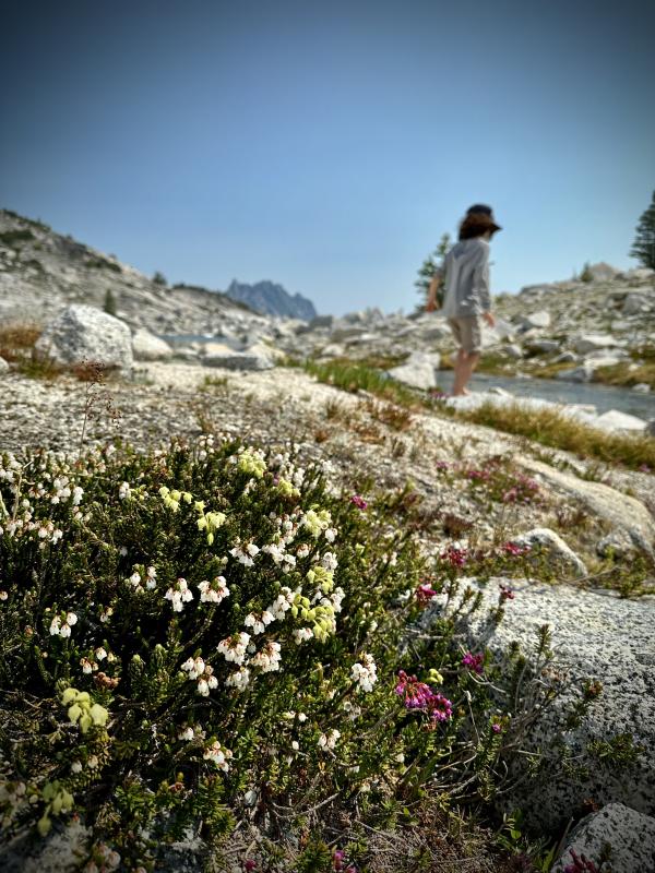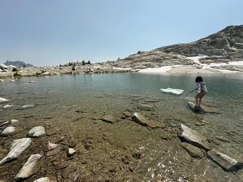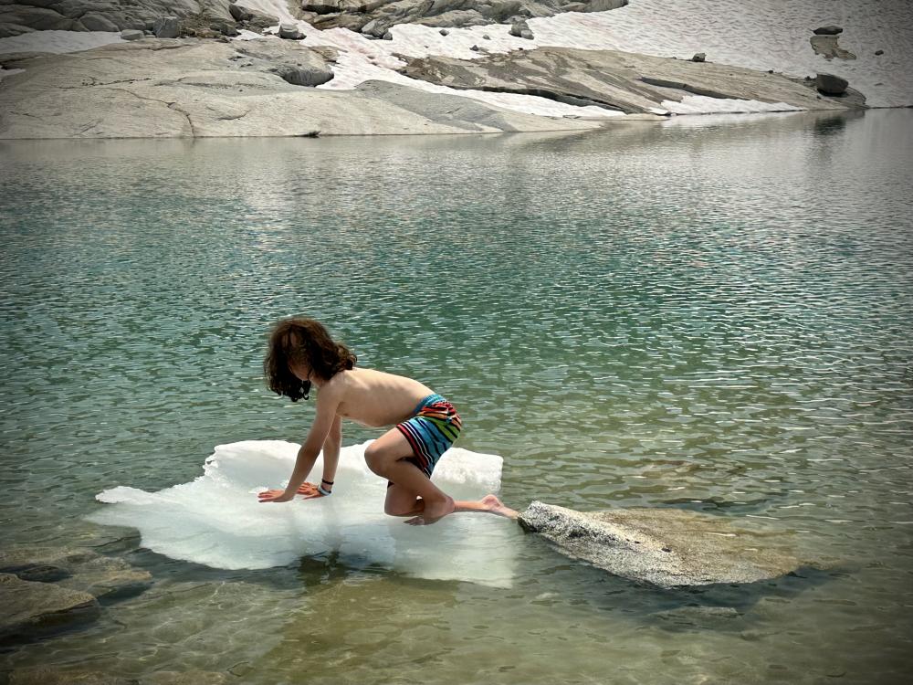 Dann geht's hinein in die Core Area. Ab hier ist wieder ein Weg erkennbar. Der Weg schlängelt sich gemächlich durch die die herrliche Landschaft hier oben.  Ein See reiht sich an den anderen, umrahmt von den umliegenden Gipfeln,  die ersten Blumen lugen zwischen den vielen Schneefeldern hervor und überall plätschert glasklares Wasser die Hänge und Felsen hinunter….fantastischheart Schon bald erreichen wir die vermeidlichen Inspiratio/Perfection Lakes …also mindestens glauben wir daswink Mein Mann meint, das Garmin zeigt den See hier als Inspiration Lake an (oder war’s Perfection Lake? - jedenfalls einer der beiden). Ich denk mir so…die sahen doch ganz anders aus im Netz und ausserdem sind wir doch noch gar nicht so weit gelaufen. Na egal. Schön ist es hier allemal, und ausser uns ist niemand da und so machen wir eine längere Pause. Die Kids finden die Eisschollen die hier noch im See schwimmen natürlich spitze und spielen damit. Sie ziehen sogar ihre Badehose an, aber nur der Kleine traut sich und auch nur ganz kurz….brrrrrr. Dafür wagt er sich aber kurz auf eine Eisscholle...in Badeshorts...sieht man auch nicht alle Tagewink