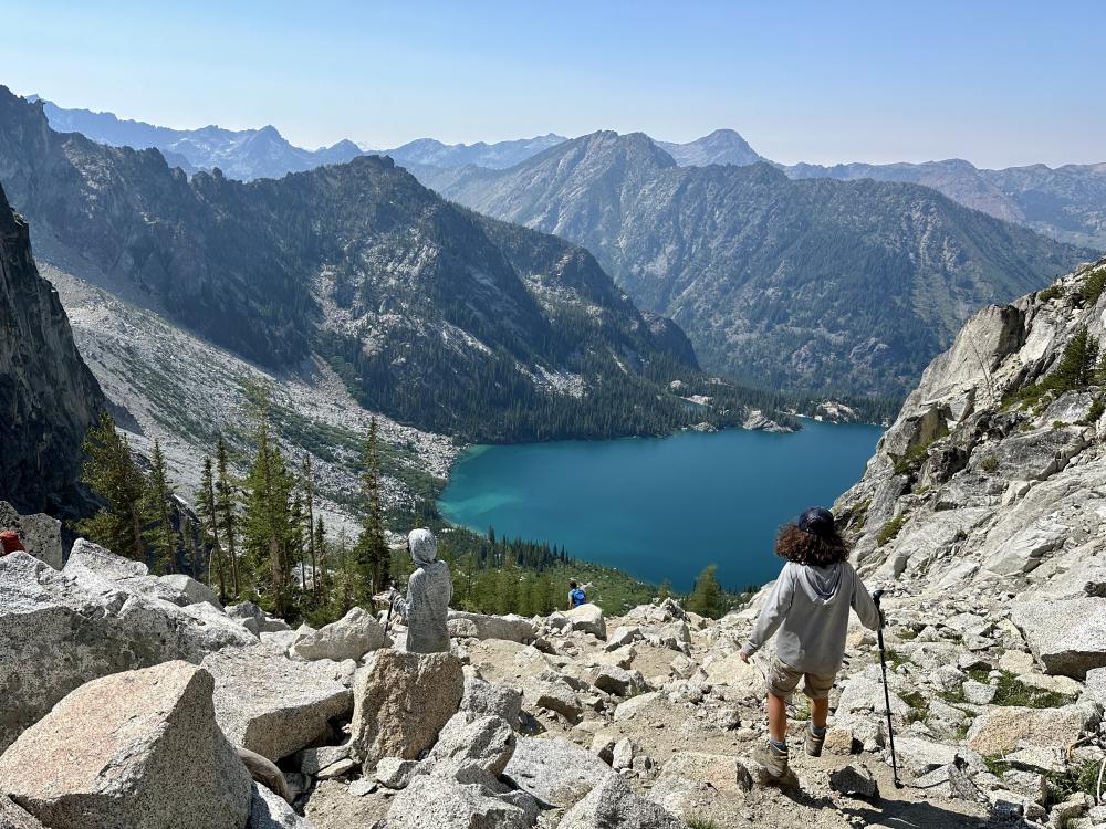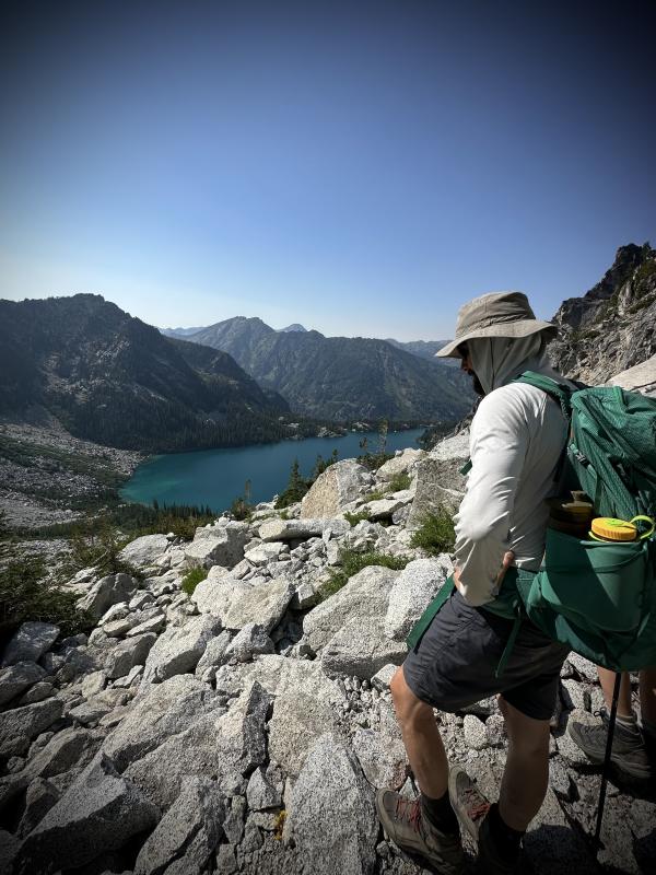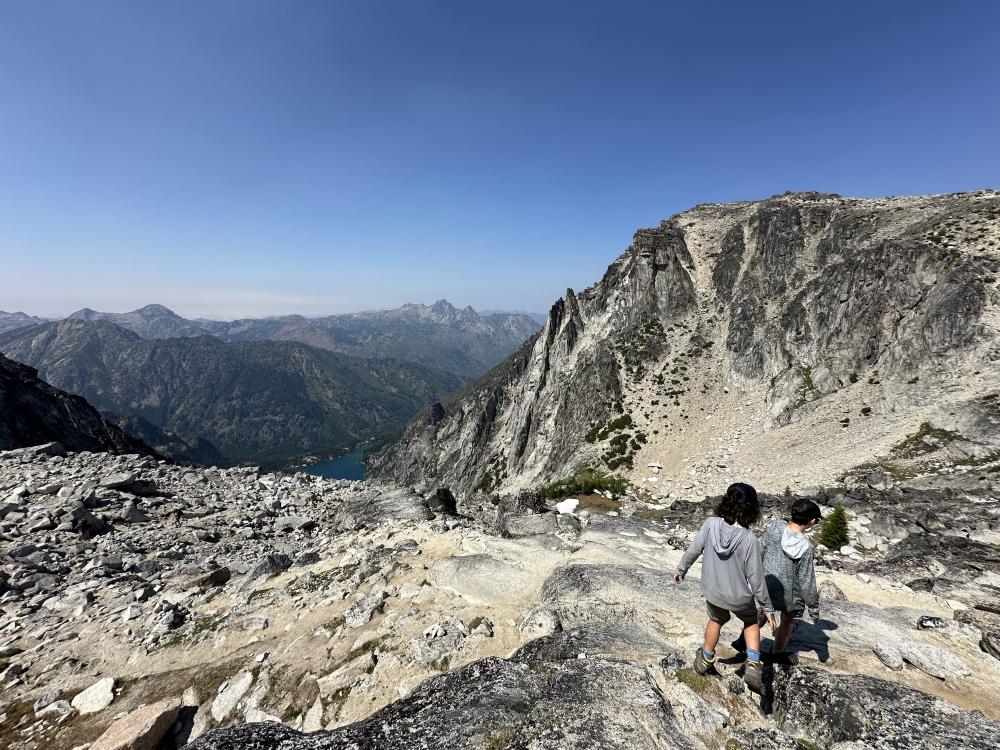 Am Aasgard Pass angekommen, stellen wir erleichtert fest, dass die Luft jetzt nun auch unten am Colchuck Lake klar ist und geniessen den jetzt noch viel schöneren Ausblick von hier oben runter zum See. Dann geht’s an den Abstieg. Das geht schon ganz schön in die Knie…immerhin sind das rund 600 Höhenmeter auf ca. 1.2 km in anspruchsvollem Gelände.  Aber wir haben’s hoch geschafft, also kommen wir auch wieder runtercheeky