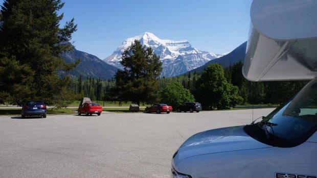 war von uns nicht so geplant, aber nachdem der Mt. Robson CG Anfang Oktober schon geschlossen war, haben wir eine ruhige Nacht (ohne Mücken) bei grandioser Sicht auf den Mt. Robson auf dem Parkplatz des VC verbracht.