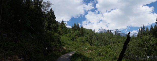 Anschließend fahren wir ein kleines Stück weiter und starten den Berg Lake Trail, der über 4.5km One Way (relativ leicht zu begehendes Terrain) bis zum Kinney Lake führt. Dieser bietet grandiose Panoramaaussichten und -spiegelungen in absolut seichtem Wasser. Leider machen uns am Seeufer wieder mal wahre Horden von Mücken schwer zu schaffen und so ziehen wir schnell und wild fuchtelnd weiter und gehen noch einmal 3.5km weiter bis zum ersten CG für Backpacker.