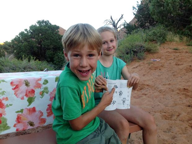 Am Parkeingang machen wir zunächst beim imposanten Visitor Center halt, wo die Kinder ihre obligatorischen Ranger Booklets abholen. Nach dem interessanten Spurenfund am Dead Horse Point investiert Niki sein Reisetaschengeld in „Scats and Tracks“ einem tollen Buch, das es den Kindern erlaubt, Wüstentiere anhand ihrer Spuren und Hinterlassenschaften zu identifizieren. Wir fahren dann recht schnell zur Site, die wir mit dem Finger an der Computertaste in der Loop im Devil's Garden schon vor Monaten ergattert haben. Sobald der Regen nachlässt, gehen Lilly und Niki auf "Scats and Tracks"-Suche.