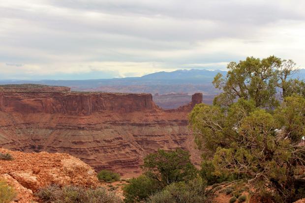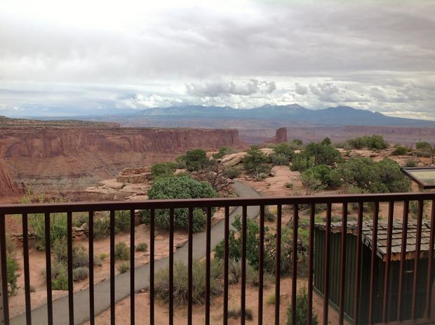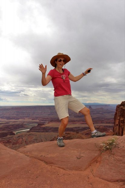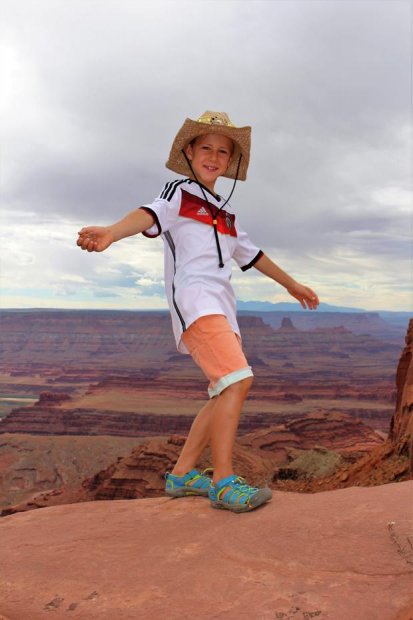 Trotz Nieselregen müssen wir irgendwann weiter, entscheiden uns aber, nur einen kurzen Hike zum Mesa Arch machen. Anschließend fahren wir noch den Grand View Point (der Name sagt alles) an, bevor wir unser anschließendes Picknick recht abrupt angesichts des immer heftiger werdenden Windes abbrechen müssen, da wir samt Essen von den stürmischen Böen buchstäblich hinweggefegt werden. Wir entscheiden uns deshalb, auf weitere Viewpoints in den Canyonlands zu verzichten und fahren bei Regen und Sturm in Richtung Arches. Das Wetter will uns einfach nicht so recht motivieren, weitere Trails zu laufen. Das schlechte Licht schluckt auch die ganzen leuchtenden Farben, so dass wir gar keine große Lust haben, Bilder von den schönen Aussichten zu machen. Da fehlt uns zum einen die nötige Technik und vor allem das fotografische Können, um auch bei diesen Bedingungen noch passable Bilder rauszuholen. Im Nachhinein können wir es so immerhin verschmerzen, dass diese wenigen Bilder auf dem Foto auch noch von der defekten Speicherkarte vernichtet wurden und wir für’s Fotobuch auf das, was auf Handy und Tablet gespeichert war, zurückgreifen müssen. Immerhin reicht es noch für zwei "schockierende" Fotos am Abgrund, bei dem man freilich nicht sieht, dass die Felsen hinter uns ganz sanft abfallen, so dass keine akute Absturzgefahr besteht: