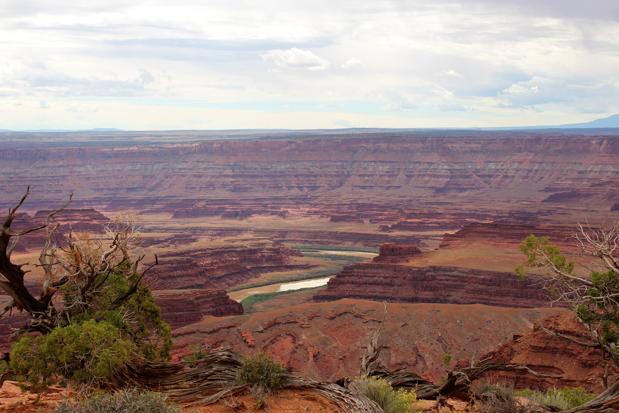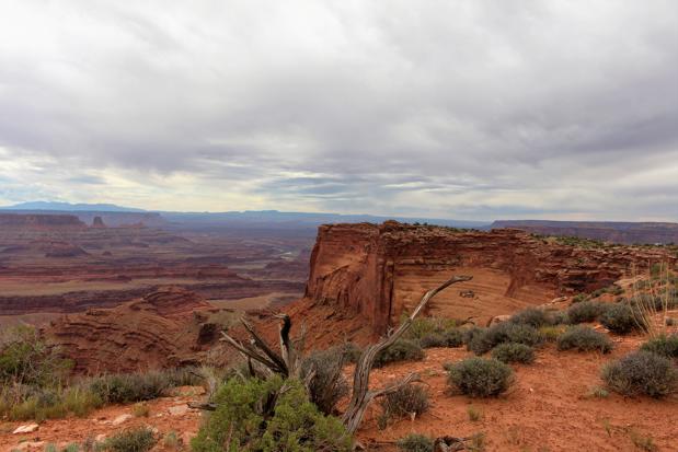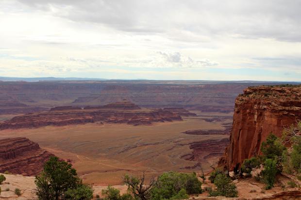 Heute ist es zum ersten Mal morgens ziemlich bewölkt und Marcus nutzt die ungewohnt frischen Temperaturen um den Rim-Trail zum Dead Horse Point zu joggen, einem Aussichtspunkt Hunderte von Metern über einer Schlaufe des Colorado River. Der Weg geht zum Teil wenige Meter an der Abbruchkante vorbei und ist schon an sich ziemlich spannend (ohne Geländer). Praktisch ist, dass man vom Campground aus direkt einsteigen kann und das Wohnmobil nicht bewegen muss.