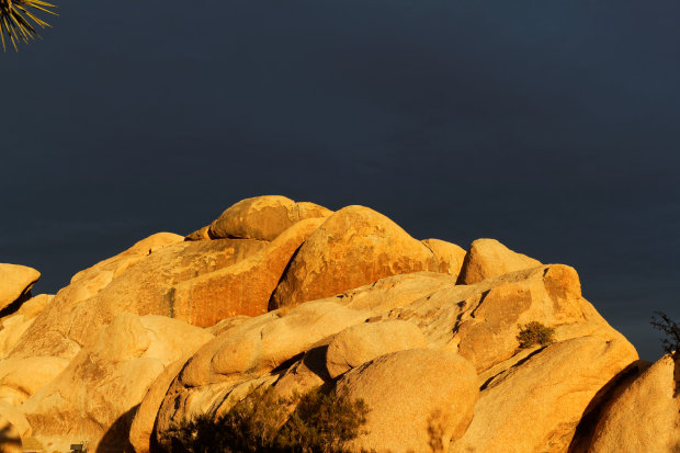 Insgesamt kommen gestern und heute nur eine Handvoll Autos entgegen. Der Park ist wie leergefegt. Wir fahren nachmittags noch raus aus dem Park, da wollen die doch tatsächlich den Eintrittsausweis nochmal sehen? Seltsam, das ist uns noch nie passiert. Wir fahren durch die Villengegend von Joshua Tree City. Es wundert, dass man den ganzen Touristenverkehr da durch schickt. Wir fahren hinten außenrum wieder rein in den Park auf den Blackrock CG. Hier geht die Straße am Home Depot und Walmart vorbei, danach geht's wieder durch eine sehr gediegene Villengegend. Die letzten 100m zum CG sind allerdings eine derartige Schlaglochpiste, dass man ganz erheblich Slalom fahren muss. Um kurz vor 16 Uhr sind wir da. Der Ranger will gerade Feierabend machen, wir erwischen ihn gerade noch und lassen uns eine Site zuteilen. Zahlen sollen wir morgen, die Kasse ist schon zu. Dumpen kostet 5$ extra, das sparen wir uns daher. Die Sites sind wunderschön, zwischen hohen Joshua Trees und mit Ausblick ins Tal.