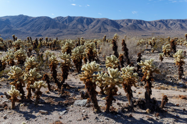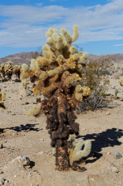 Wir fahren weiter zum Cholla Cactus Garden. Der ist total süß! Es sind Arbeiter daran, die schwarzen abgefallenen Kakteenreste in Säcke zu packen. Beim Fotos machen kommt André versehentlich an einen der Kakteen hin. Der Name jumping Cactus für die hier vorherrschende Gattung bestätigt sich, es ist aber nicht so schlimm. Man sollte die Dinger aber wirklich nicht anfassen, auch wenn sie kuschelig aussehen, den die pieksen wirklich gemein und die Stacheln bekommt man nur mühsam und einzeln wieder aus Haut und Kleidung heraus.