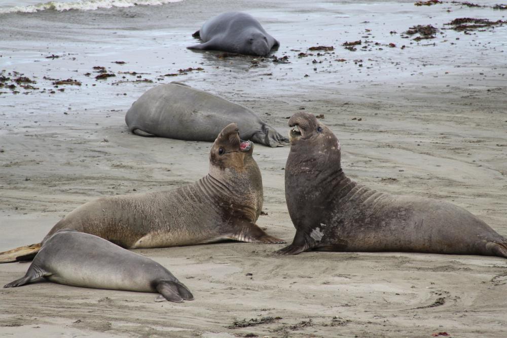 Heute lautete unser Ziel Santa Barbara. Schon bald hatten wir unsere sieben Sachen im Auto verstaut und wir machten uns auf den Weg. Da ich sehr gerne die See-Elefanten bei San Simeon sehen wollte, entschieden wir uns für diesen Umweg, welcher uns zwar fast eine Stunde mehr Autofahrt kostete, sich aber anscheinend lohnen sollte. Und ja, es hatte sich gelohnt – definitiv! Die mächtigen See-Elefanten-Bullen, die in grosser Anzahl am Strand lagen und wir aus nächster Nähe beobachten konnten, waren wirklich sehr eindrücklich. Auch die, welche sich im Wasser balgten und dabei komische Geräusche von sich gaben, waren interessant, anzuschauen. Eine freiwillige Helferin der „Freunde der See-Elefanten“ fragte uns als wir da waren, ob wir gerne See-Elefantenhaut anfassen wollten und hielt sie uns hin. Sie erzählte dann ein bisschen über diese Tiere. Die Informationen waren sehr interessant. Als sie uns fragte, woher wir kommen, meinte sie, sie sei letztes Jahr in der Schweiz gewesen und dies sei „the most beautiful place in the world“ und sie würde bestimmt wiederkommen.