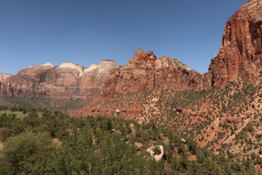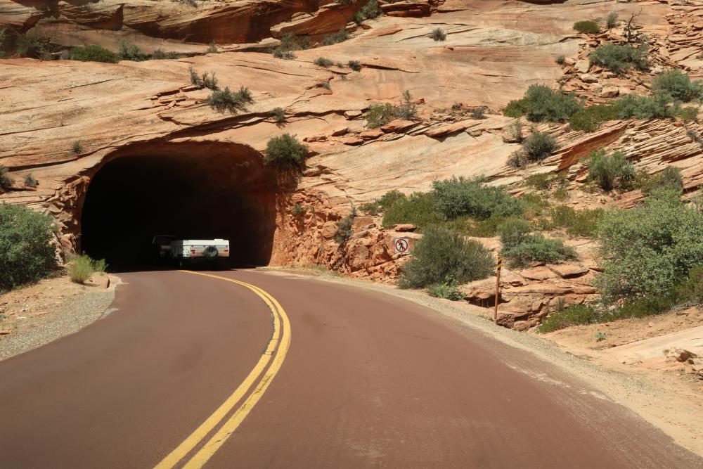 Als wir später auf dem Campground zurückwaren, haben wir zuerst mal gefrühstückt. Hier unter den Bäumen schien es gefühlte 10 Grad kälter zu sein, als vorne am Rim. Bei 15 Grad frühstückten wir dick eingepackt in Faserpelz und Regenjacke. So gegen 10 Uhr machten wir uns dann auf in Richtung Zion NP. Unterwegs mussten wir noch einkaufen – wir hatten nichts mehr fürs Nachtessen. Doch wie auch in den anderen kleinen Ortschaften, war die Auswahl auch hier in Orderville sehr beschränkt. Kein frisches Gemüse, keine Früchte, nur tiefgekühltes Fleisch. So entschieden wir uns für Chicken Nuggets, Teigwaren und Tiefkühl-Broccoli. Der Wasservorrat musste auch noch aufgefüllt werden. Schon bald kamen wir zum Parkeingang des Zion Nationalparks. Die nette Dame an der Kasse wies uns daraufhin, dass wir für die Tunneldurchfahrt einen Escort-Service in der Höhe von 15 Dollar zahlen müssen. Dieser Service bestand darin, dass ein Parkmitarbeiter dafür sorgte, dass in dieser Zeit, in der wir (und natürlich auch noch andere) durch den Tunnel fuhren, keine Autos entgegenkamen, so dass wir in der Mitte des Tunnels fahren konnten und keine Probleme hatten mit der Höhe. Schon die ersten paar Meilen im Nationalpark waren einfach gewaltig. Der blaue Himmel, die roten Felsen und das Grün der Büsche und Bäume ergaben eine wunderschöne Farbenpracht. Vor dem besagten Tunnel wollte ich eigentlich noch einen kurzen Trail zu einem schönen Overlook laufen. Doch einen Parkplatz zu ergattern war ein Ding der Unmöglichkeit, weshalb der kurze Spaziergang zum Overlook leider ausfiel.