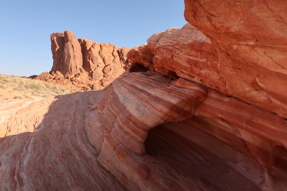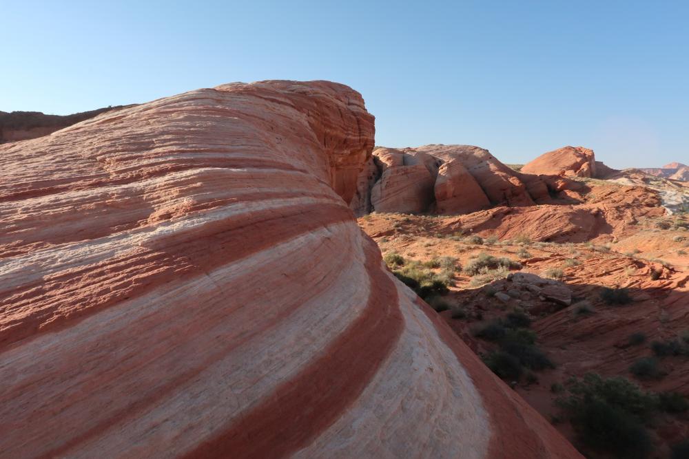Heute war ich früh wach. Gut so, denn wir wollten früh morgens noch vor dem Frühstück und der grossen Hitze den kurzen Trail zur Fire Wave laufen. Als ich zum Fenster hinaus schaute, sah ich bereits ein wunderschönes Morgenrot. Ich konnte nicht anders, als mich anziehen und nach draussen zu gehen. Kaum war ich ein paar Schritte vom Camper entfernt, erschienen bereits die ersten Sonnenstrahlen am Horizont. In dieser wunderbaren Gegend einen so schönen Sonnenaufgang zu sehen, war genial! Bevor wir losfahren konnten, mussten wir noch das Wasser und den Strom abhängen. Das war aber gar nicht so einfach. Am Wasserhahn hatten sich dutzende von Bienen angesammelt in der Hoffnung, auch einen Tropfen Wasser zu erwischen. Erst mit Mückenspray gelang es uns, diese einigermassen zu vertreiben, damit wir den Schlauch abhängen konnten. Anschliessend fuhren wir zum Parkplatz, von welchem aus der Trail startete. Die Temperaturen waren schon sehr warm und so waren wir froh, dass ein Teil des Trails noch im Schatten war. Bei der Fire Wave angekommen, knipsten wir natürlich Fotos. Auch wenn wegen dem Sonnenstand die Wave nicht so eindrücklich gewirkt hatte, wie wir erhofft hatten. Immerhin begegneten wir noch einem Leguan. Zurück auf dem Campground frühstückten wir und dann hiess es auch schon wieder Abschied nehmen von diesem wunderschönen Plätzchen.