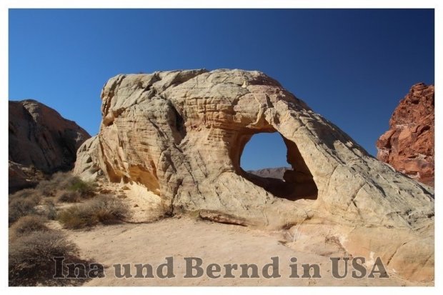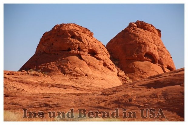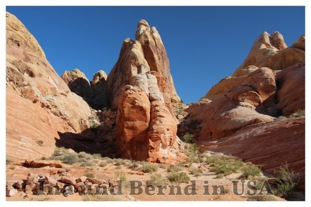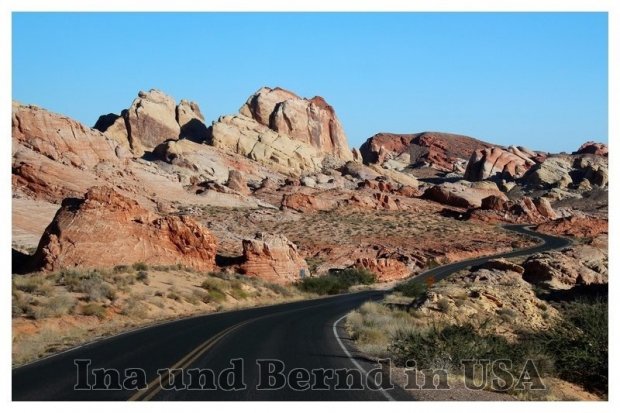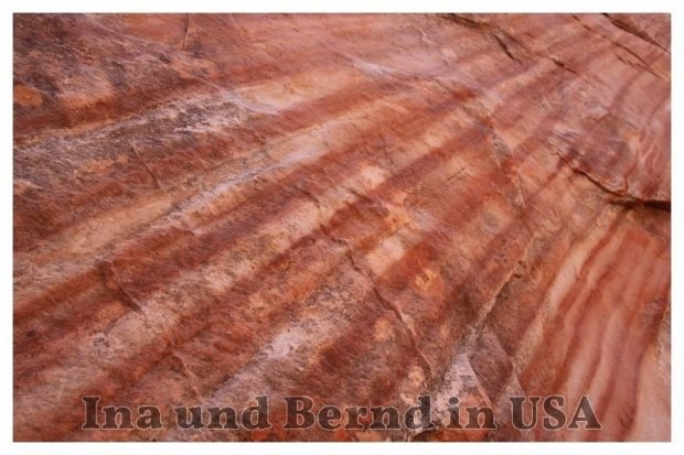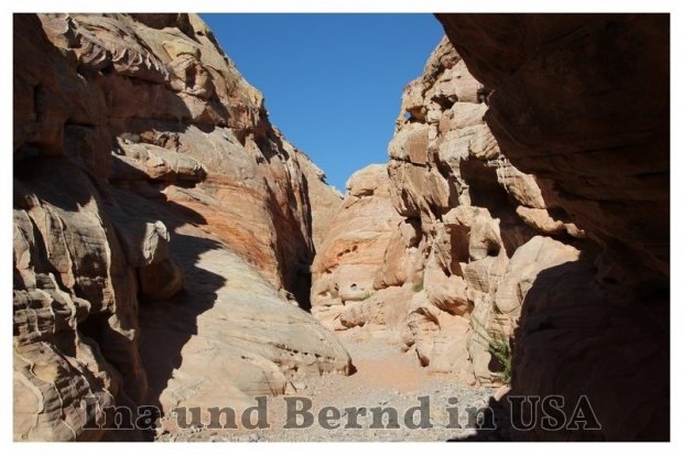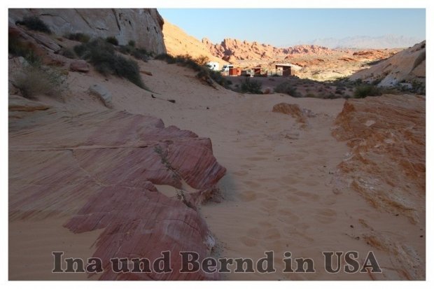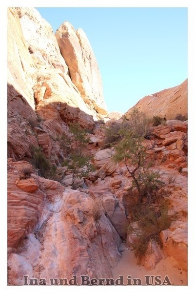 Wir wollten uns noch etwas genauer das Valley of Fire anschauen und ich schlug eine kleinere Wanderung in den White Domes vor. Es war noch früh und nicht so warm und die knapp 2 km für den Loop klangen gar nicht schlecht. Trotzdem machten wir unsere zwei Flaschen, die man an einer Gürtelschlaufe befestigt, fertig. Ich meinte zwar das wäre nicht nötig, aber Ina bestand darauf.