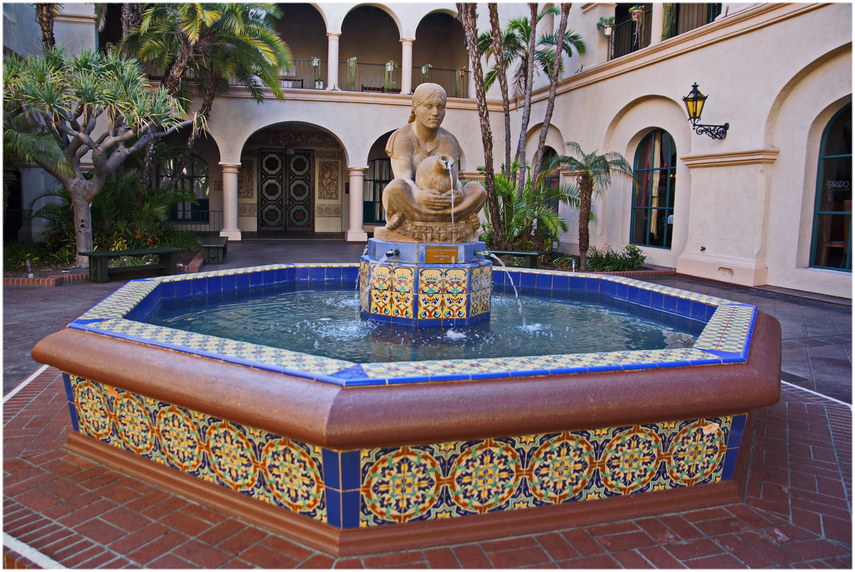 Dann zu Casa del Prado Theatre und Botanical Building – davor Lily Pond (WWII Becken für Physiotherapie)