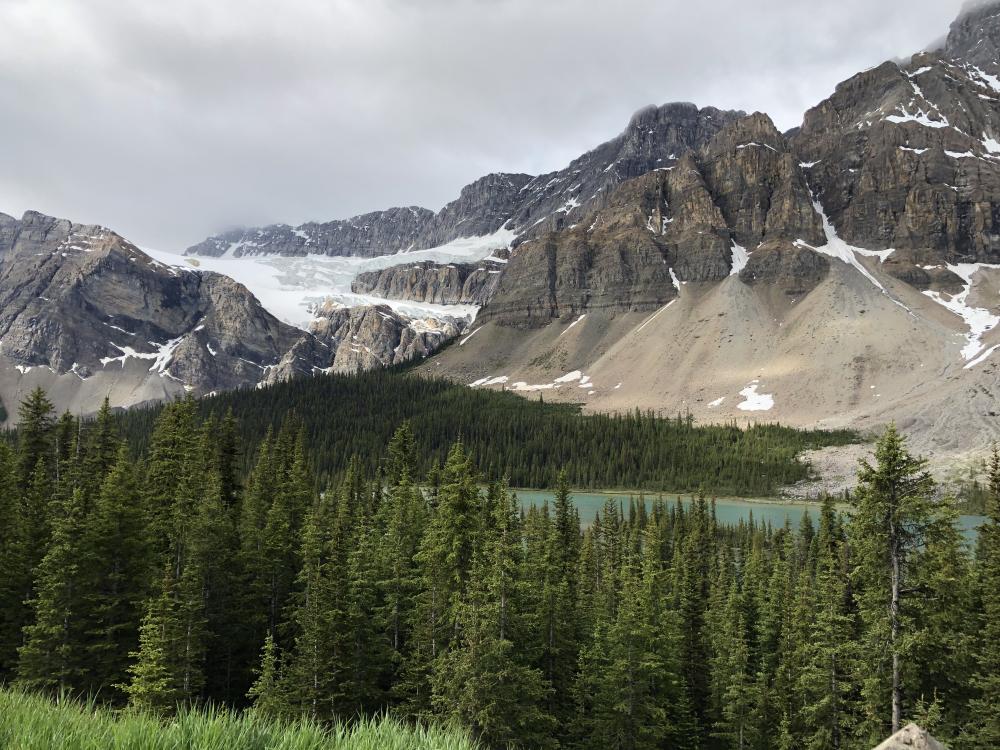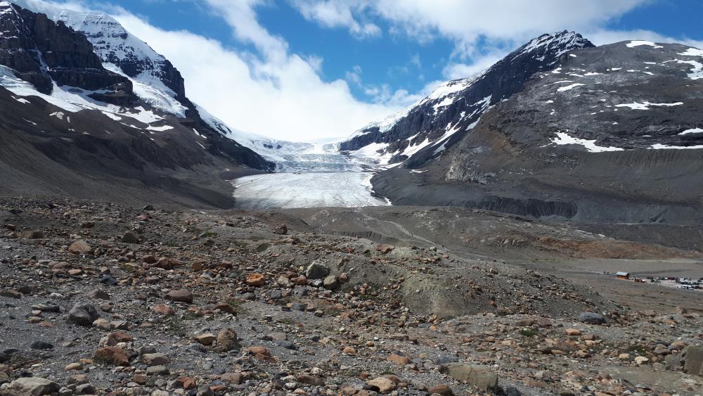 Wir genießen die tollen Ausblicke bei wechselnder Bewölkung und fahren zunächst an unserem heutigen Campground dem Rampart Creek CG vorbei zum Columbia Icefield. Eine größere Wanderung zum Parker Ridge wagen wir heute nicht, da das Wetter immernoch sehr wechselhaft und unbeständig ist. Wir parken links der Straße auf dem ersten der beiden Parkplätze und laufen bei frischem Wind in Richtung Gletscherzunge.