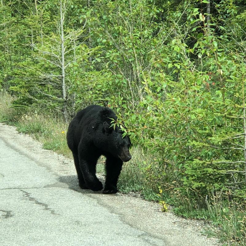 Bald danach sehen wir unseren ersten Schwarzbären. Wir halten zunächst in einigem Abstand hinter den anderen Autos und bestaunen den Bär vom Fahrzeug aus. Als die vorderen Fahrzeuge sich in Bewegung setzen läuft der Bär am Straßenrand entlang, direkt an unserem Wohnmobil entlang. Wir warten bisher an uns vorbei ist und setzen dann auch unsere Reise fort.