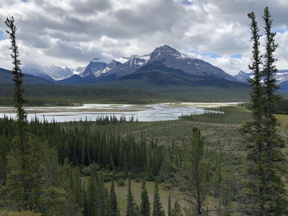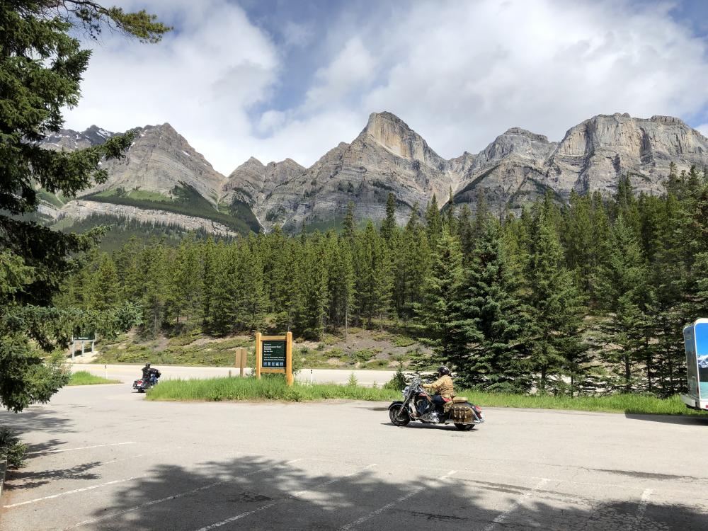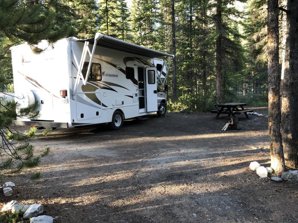 Danach statten wir dem Information Center einen Besuch ab und genießen mit einem Kaffee und Sonnenschein ausgiebig den Ausblick und das Wifi auf der Besucherterrasse. Dann geht es zurück auf unseren heutigen Campground. Wir stellen fest, dass es sich lohnt den Icefield Parkway in beide Richtungen zu befahren, da sich durch die geänderte Perspektive ganz neue Ausblicke ergeben. Auf dem Rampart Creek CG werden wir vom netten Camp Host in Empfang genommen und beziehen Site #40. Der Platz gefällt uns gut, auch wenn die enge Einfahrt zu unserem Stellplatz etwas tricky ist. Aber wenn man sich mal an die Ausmaße des Gefährtes gewöhnt hat, ist dies kein Problem mehr.