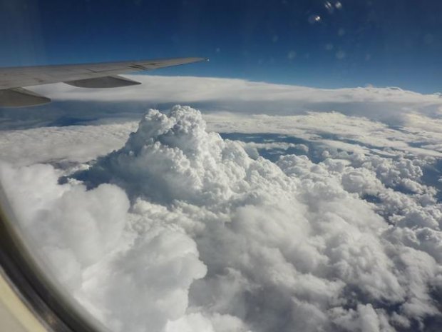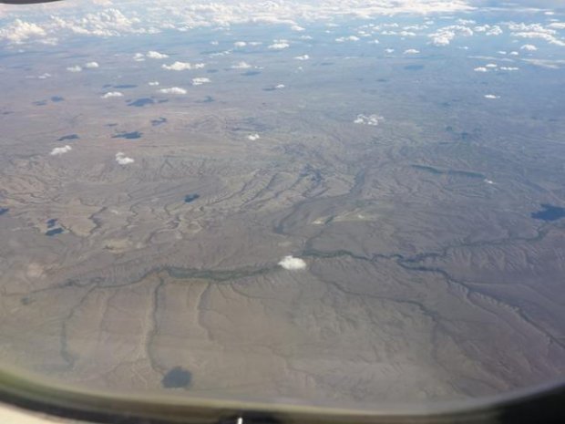 Wir fliegen heute eine kleine 757 mit 36 Reihen, wir sitzen Reihe 35, somit also fast ganz hinten. Das Flugzeug schwanzelt ganz schön bei dem Wind, als wir starten (13.15 Uhr Ortszeit), und wir tanzen in den Himmel...(ich muss mich sofort mit dem Fotoapparat beschäftigen, sonst wird mir schwummrig im Bauch).