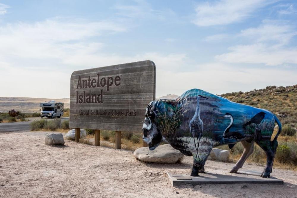 Nach dem Frühstück fahren wir um 8:30 Uhr vom Campground. Wir möchten den Morgen noch auf Antelope Island verbringen und danach in Richtung Yellowstone NP weiterfahren. Schon kurz nach dem Campground halten wir am Strassenrand. Steht doch da ein Bison und kratzt sich am Verkehrssignal. Wir fahren der Antelope Island Road entlang nach Süden. Wir sehen unzählige Bisons am Strassenrand und auch welche, die vor unserem RV die Strasse überqueren. So schön! Natürlich werden diese Prachtkerle ausgiebig fotografiert.