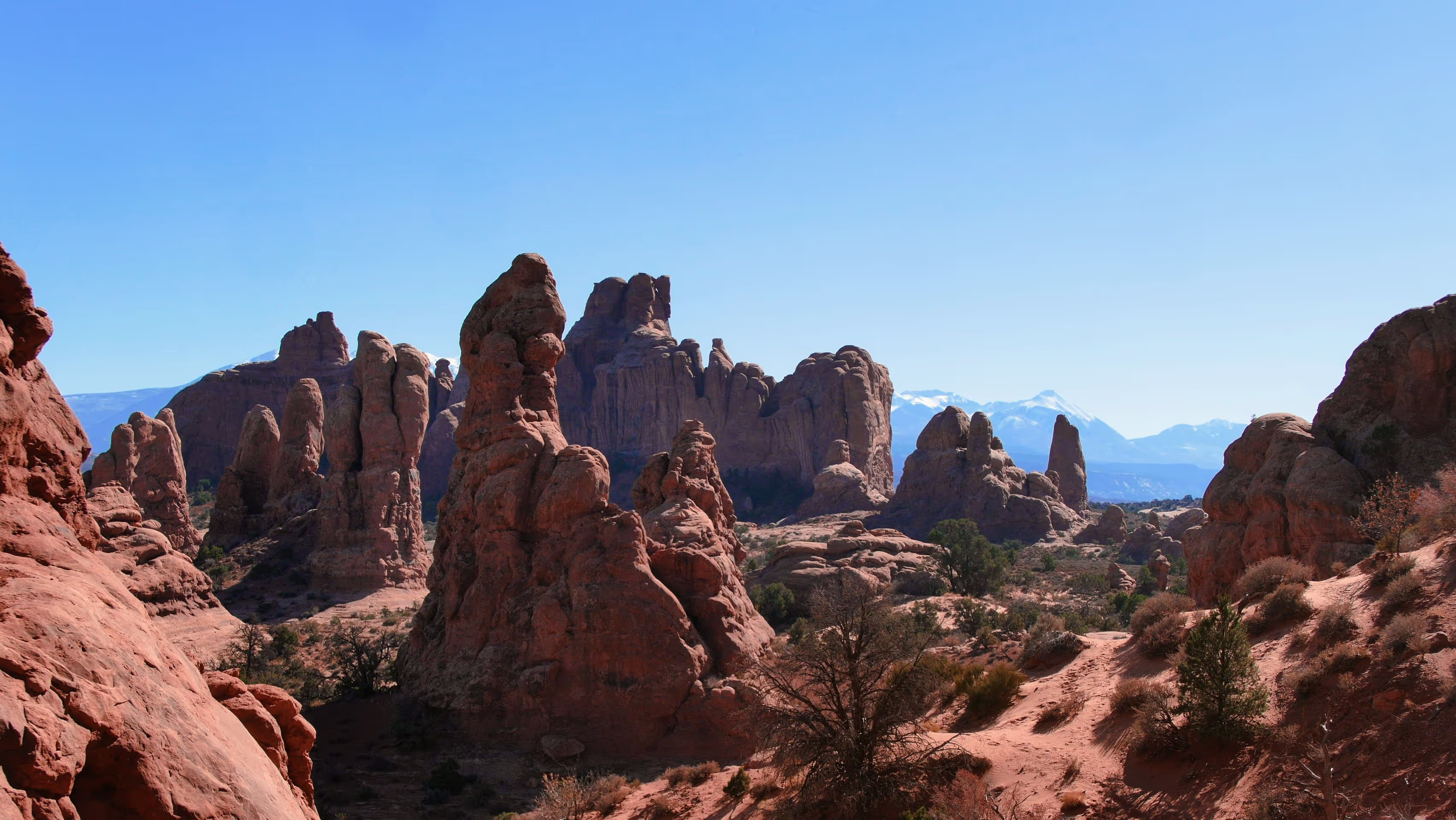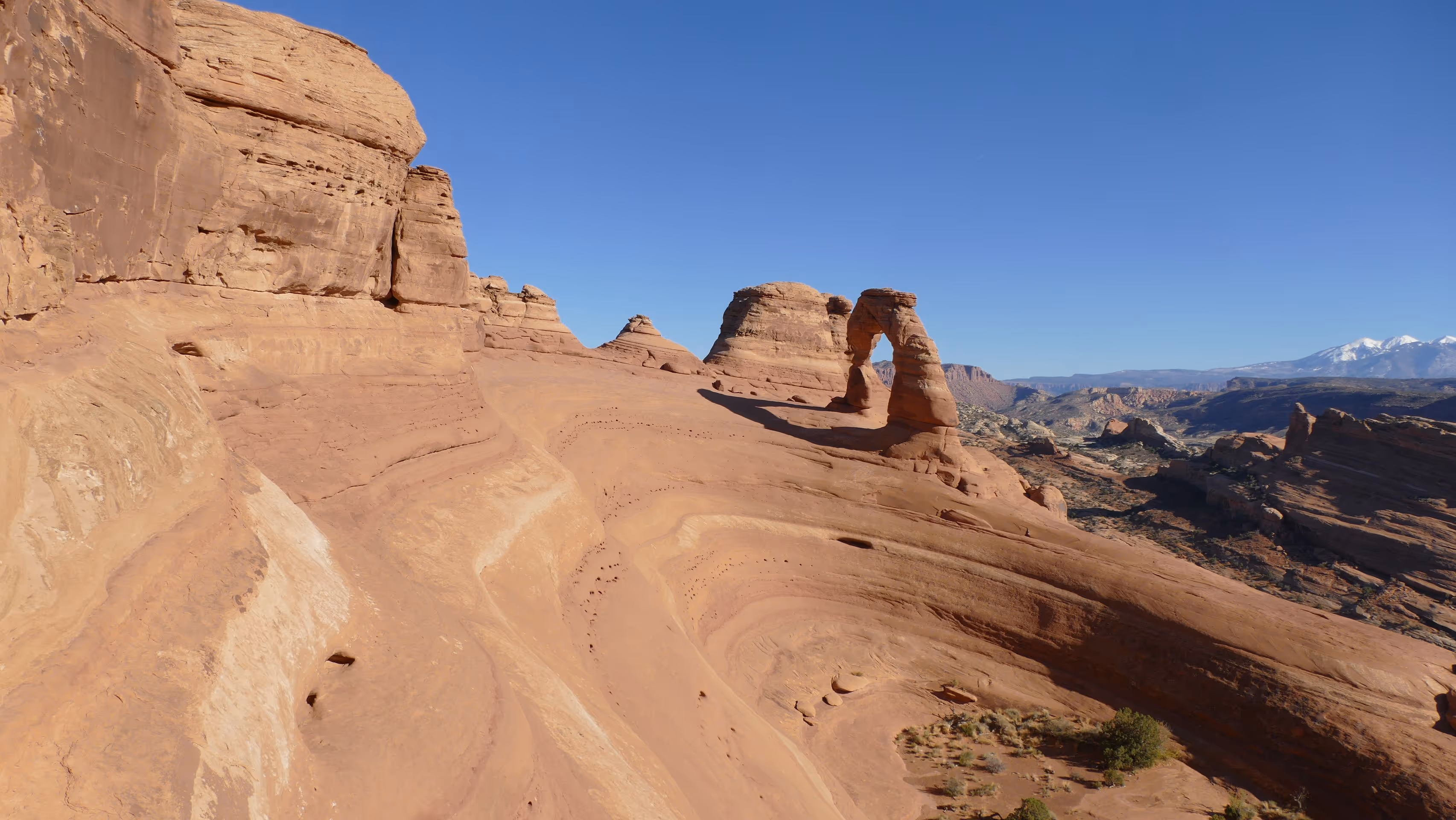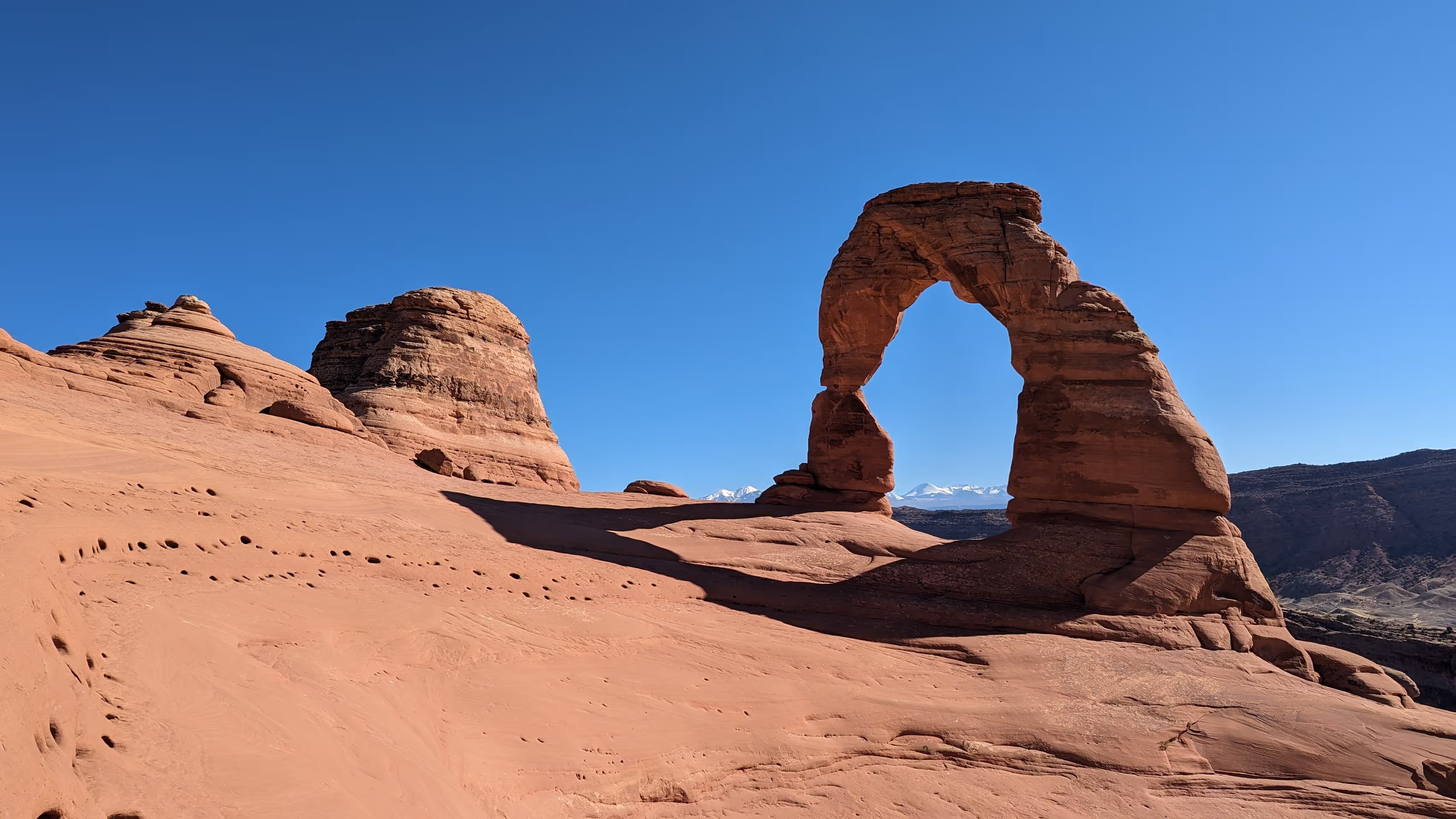 Der Delicate Arch, wohl bekannteste Steinbogen der USA, im Hintergrund die verschneiten Gipfel der La Sal Mountains.