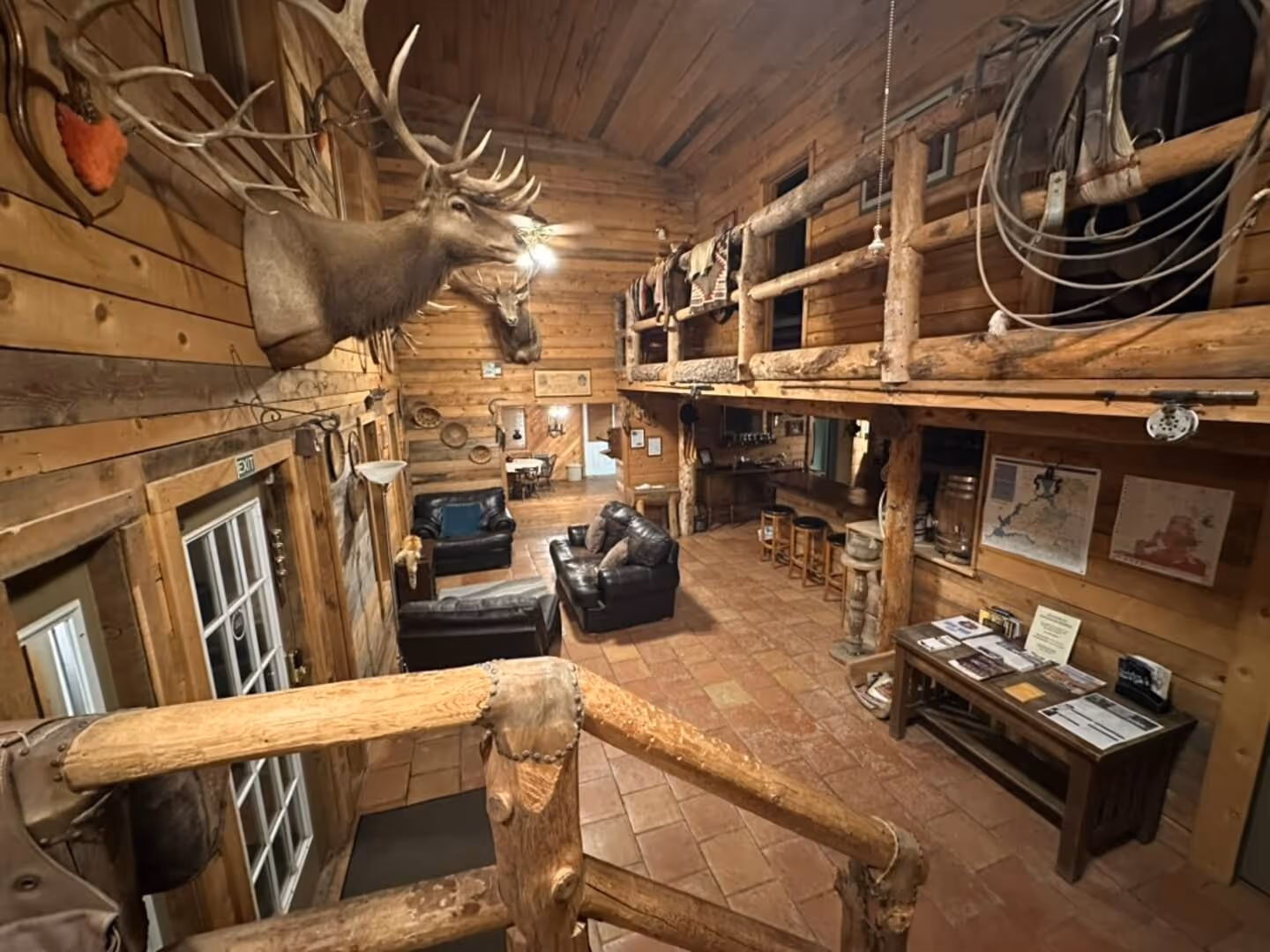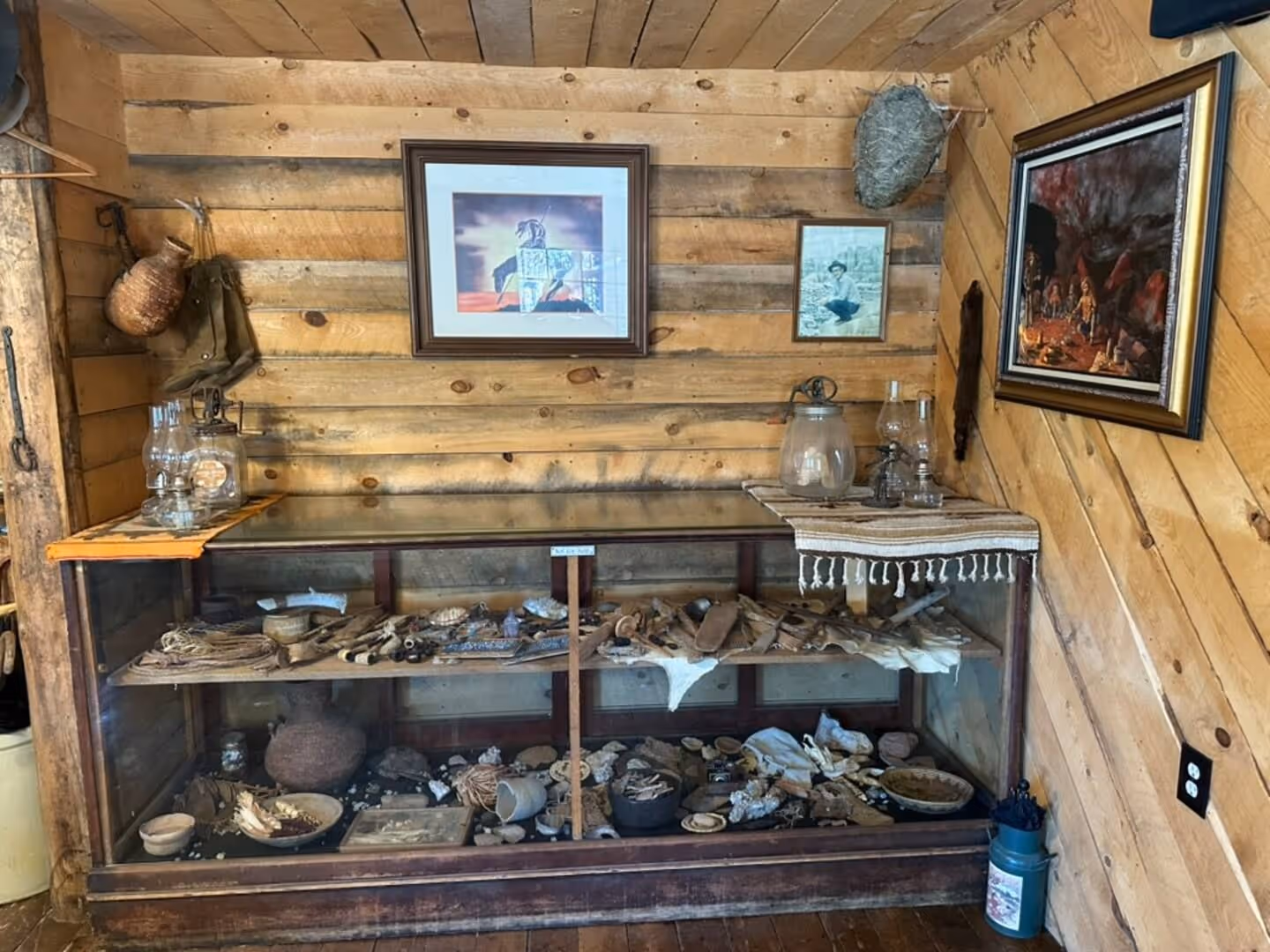 Drinnen empfängt uns der Duft von trockenem Holz und altem Leder. Die Hütte ist gemütlich im Western-Style eingerichtet. Tierfelle und Jagdtrophäen zieren die Wände, dazwischen hängen Sättel und Indianerdecken. In Vitrinen liegen Artefakte der Ureinwohner, in Regalen stapeln sich Bücher, daneben Hüte, Instrumente, alte Revolver, Petroleumlampen.