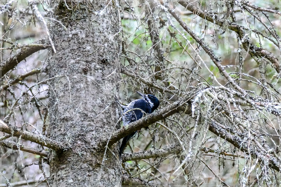 Erst hören wir den Specht nur, dann sehen wir ihn auch.
