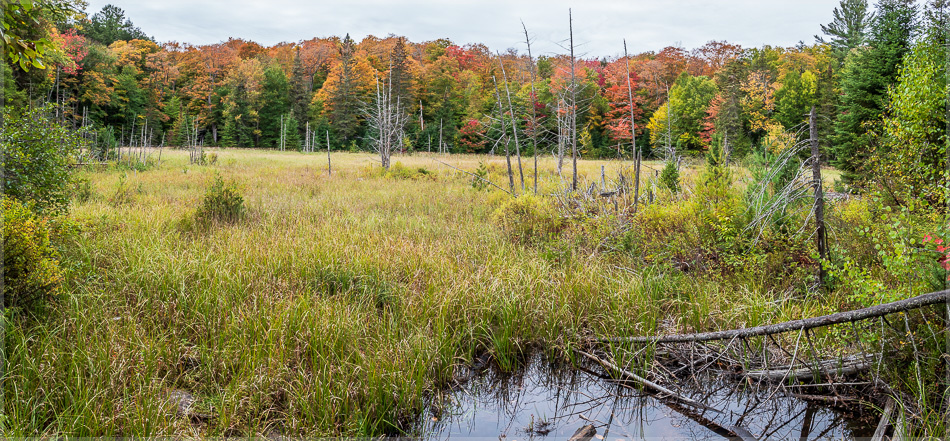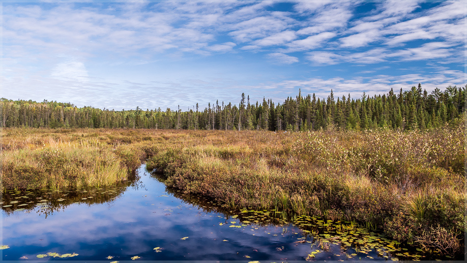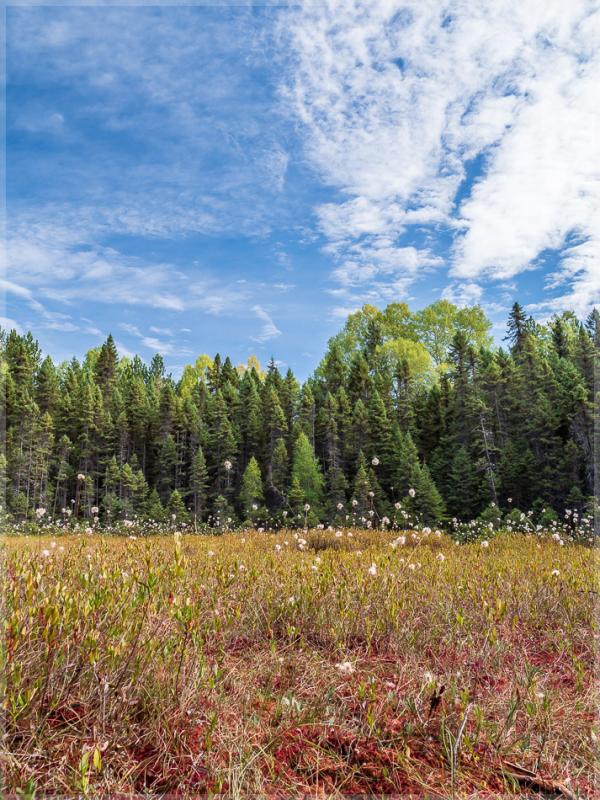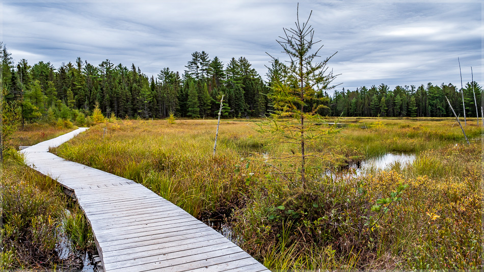 Anschließend laufen wir den Spruce Bog Trail (1,5km -0,5h - „Easy“) über Holzstege durchs Moorgebiet und flach durch Nadelwald.