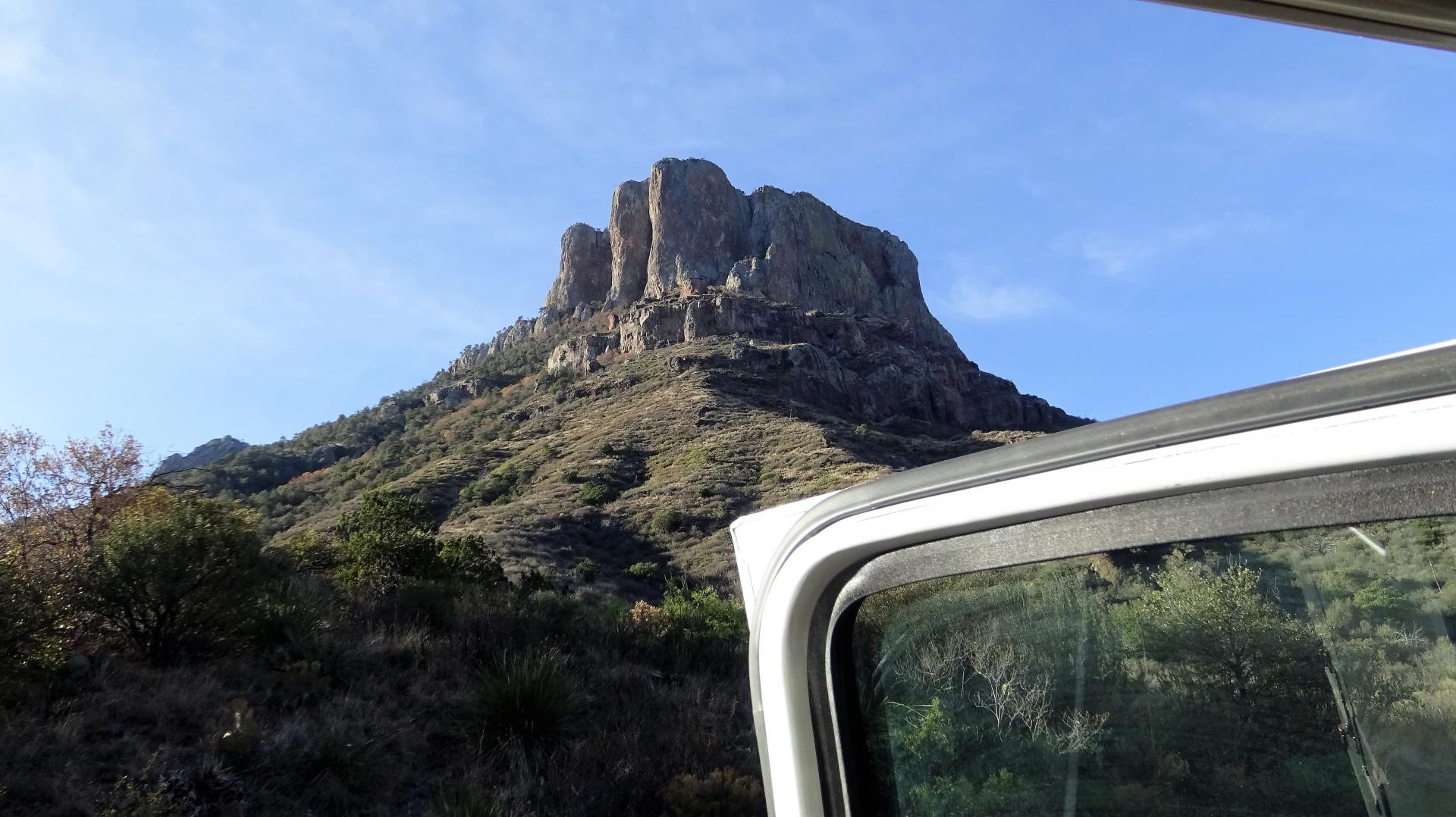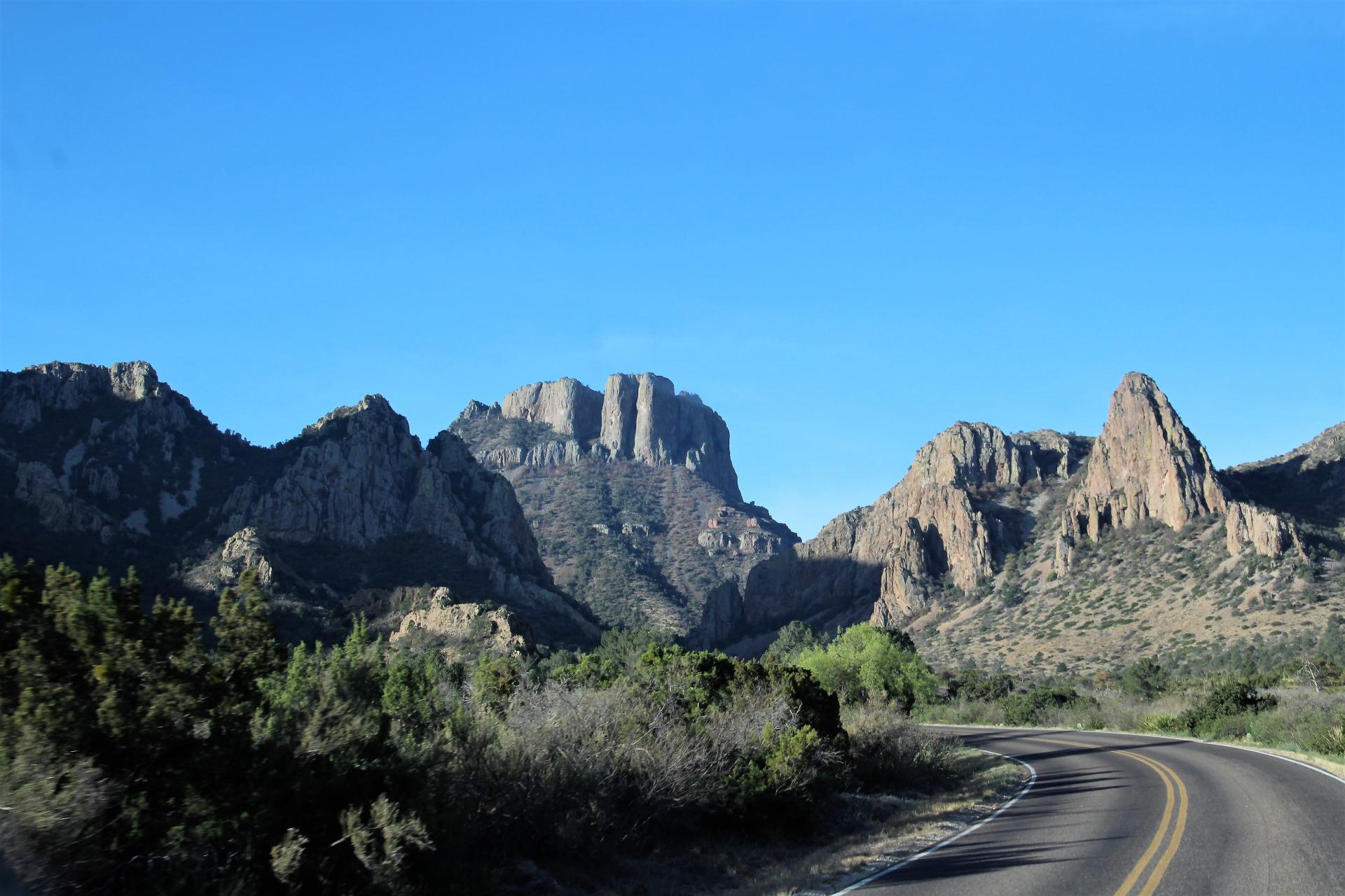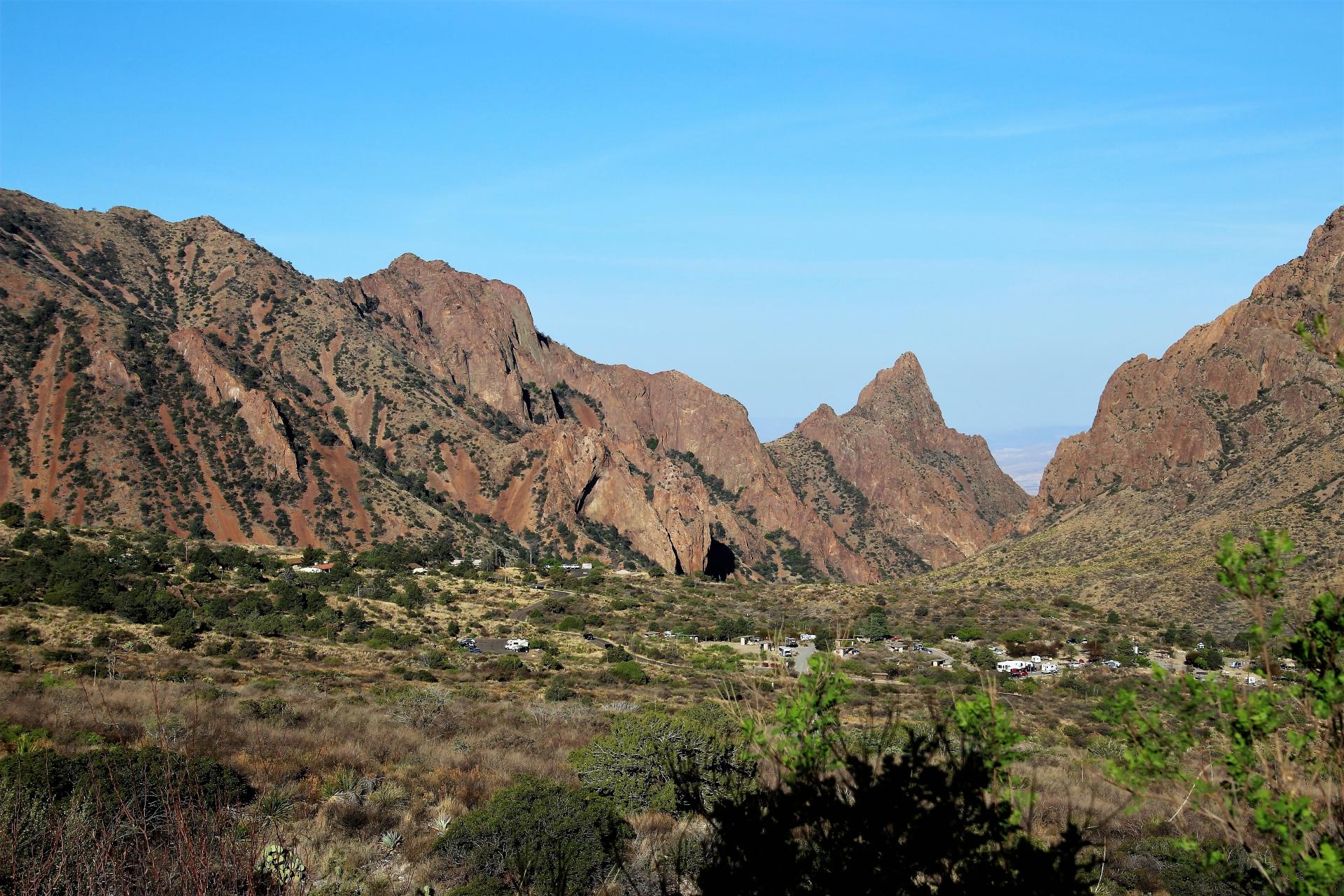 Dort halten wir dieses Mal nicht an und fahren weiter in westliche Richtung. Wir wollen aber noch einen kurzen Abstecher in die Berge machen, um auch diese Ecke des Big Bend NP mal zu sehen. Die Fahrt geht nun bergauf zum Chisos Basin. Die Sonne strahlt erst die Spitzen der Berge an, bis zum Tal reicht sie noch nicht. Es geht durch eine schöne Landschaft in Kurven bergauf bis auf eine Höhe von 1.600 m. An einem Aussichtspunkt haben wir einen herrlichen Blick auf den Chisos Basin Campground. Er liegt wunderschön eingebettet zwischen den Bergen. Wenn ich gewusst hätte, dass wir nur so ein kleines Wohnmobil bekommen, hätte ich hier mindestens eine Nacht reserviert.