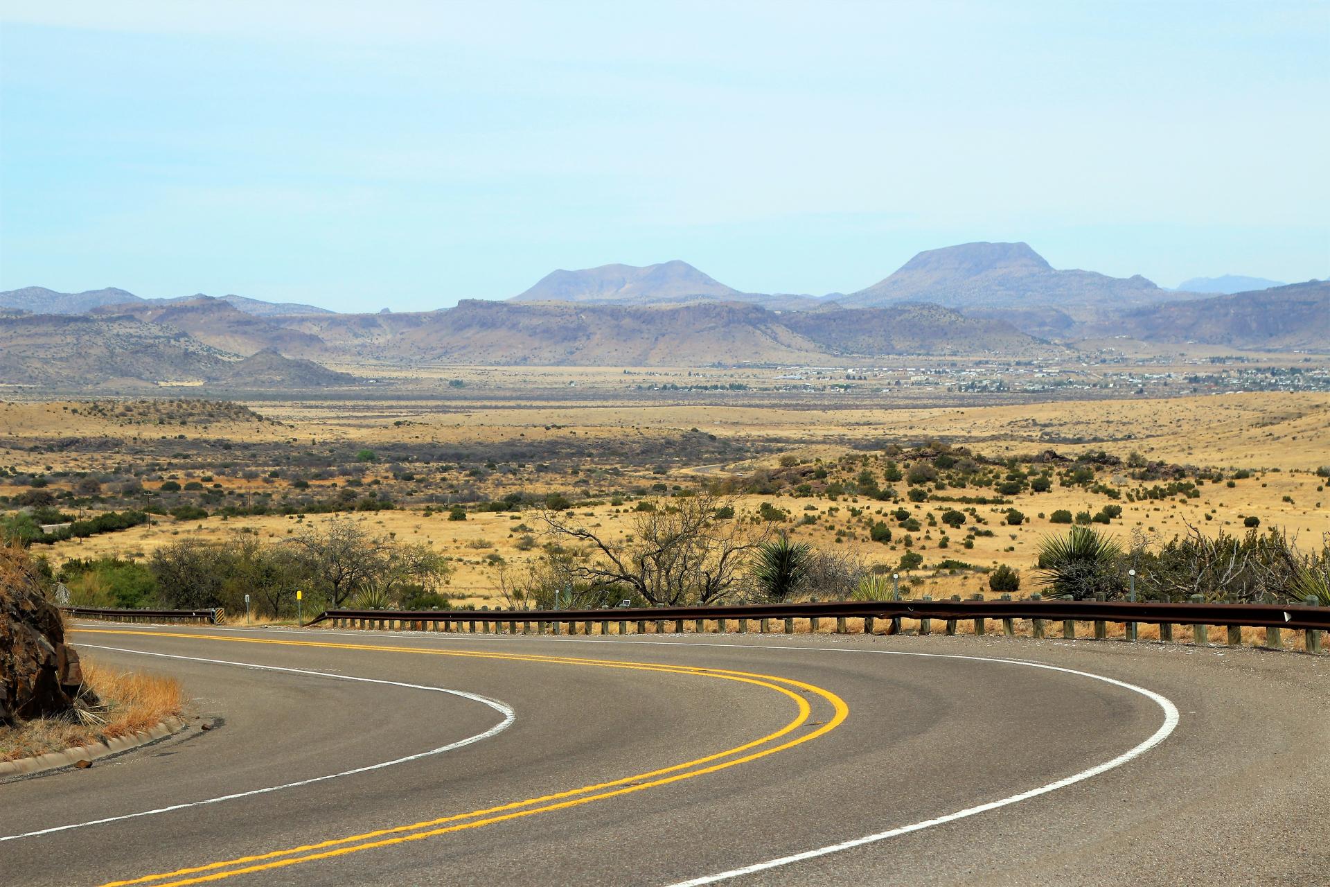 Nun ist die Ebene mit hellbraunem Präriegras bedeckt, auf denen Kühe und Pferde weiden. Viele Ranches prägen das Bild. Etwas weiter wird es wieder bergiger und wir haben einen herrlichen Blick in das Tal, in dem das Städtchen Alpine liegt.
