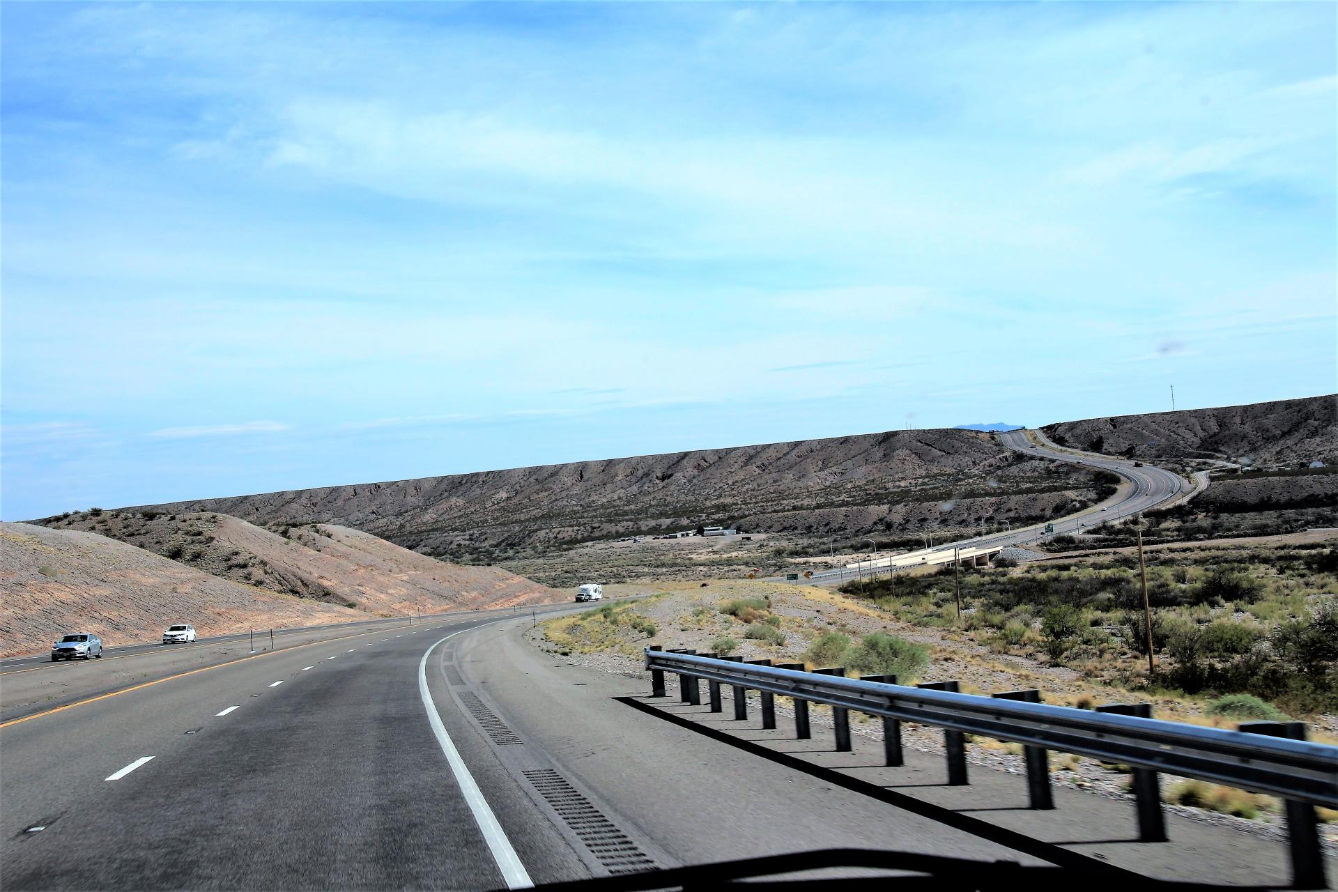 Die Fahrt ist abwechslungsreich. Links und rechts kommen Hügel und Berge in Sicht, es geht ständig bergauf und bergab. Überall wachsen Kreosotbüsche, die schön gelb blühen und mit ihrem Grün für Farbtupfer in der recht grauen Landschaft sorgen.