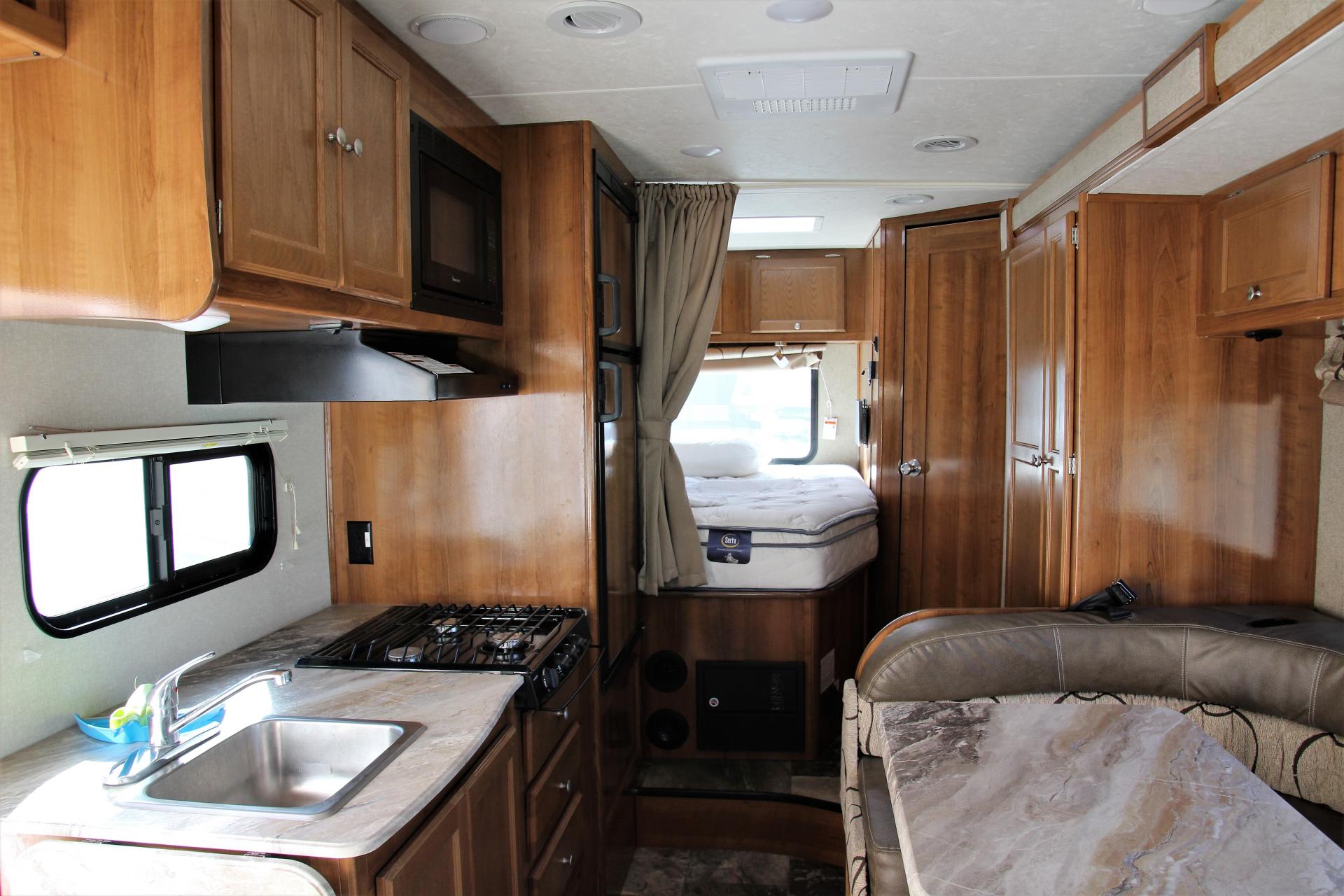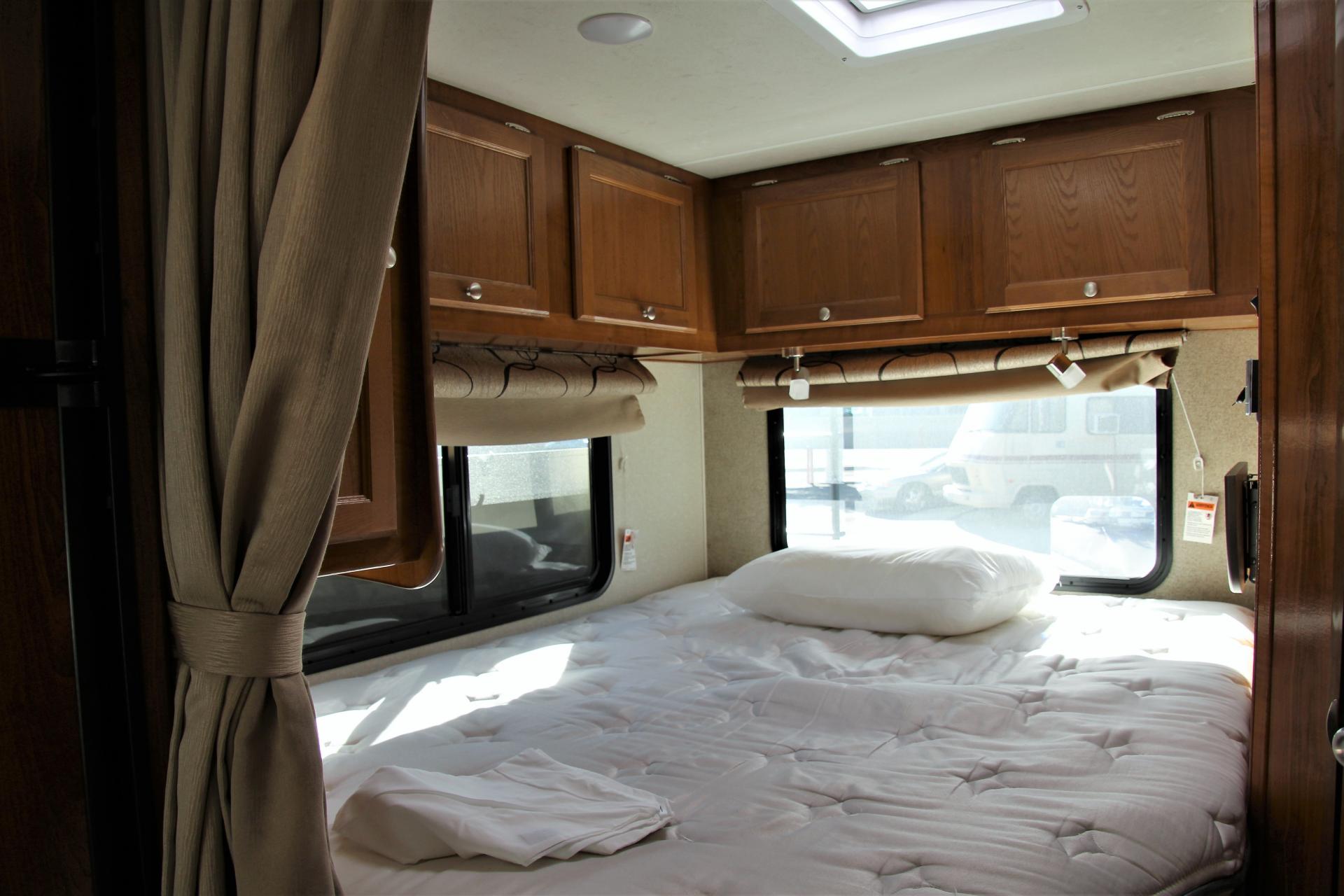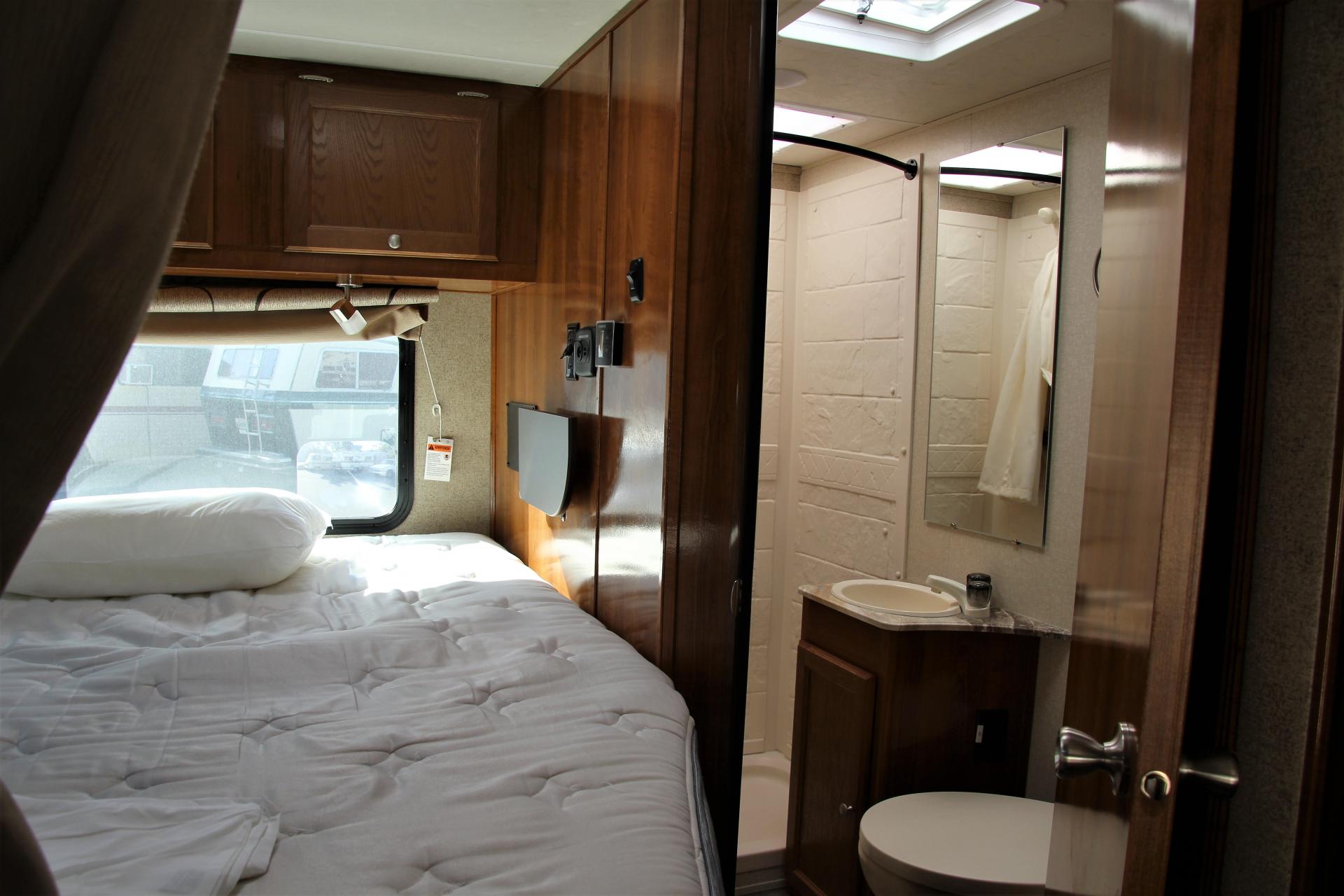 Nun gehen wir zu unserem neuen Wohnmobil und sind begeistert über die Größe. Es hat nur 2.185 Meilen auf dem Tacho und ist wunderbar geräumig. Das Bett ist bereits bezogen und es ist bequem zugänglich. Eine tolle Panoramascheibe gibt es im Schlafraum auch. Wir sehen uns aber trotzdem alles genau an und testen vor allem die Wasserpumpe. Diese funktioniert einwandfrei. Wie bereits geschrieben, haben wir die Probleme mit der Wasserpumpe geschildert, aber das scheint ein bekannter Fehler zu sein.