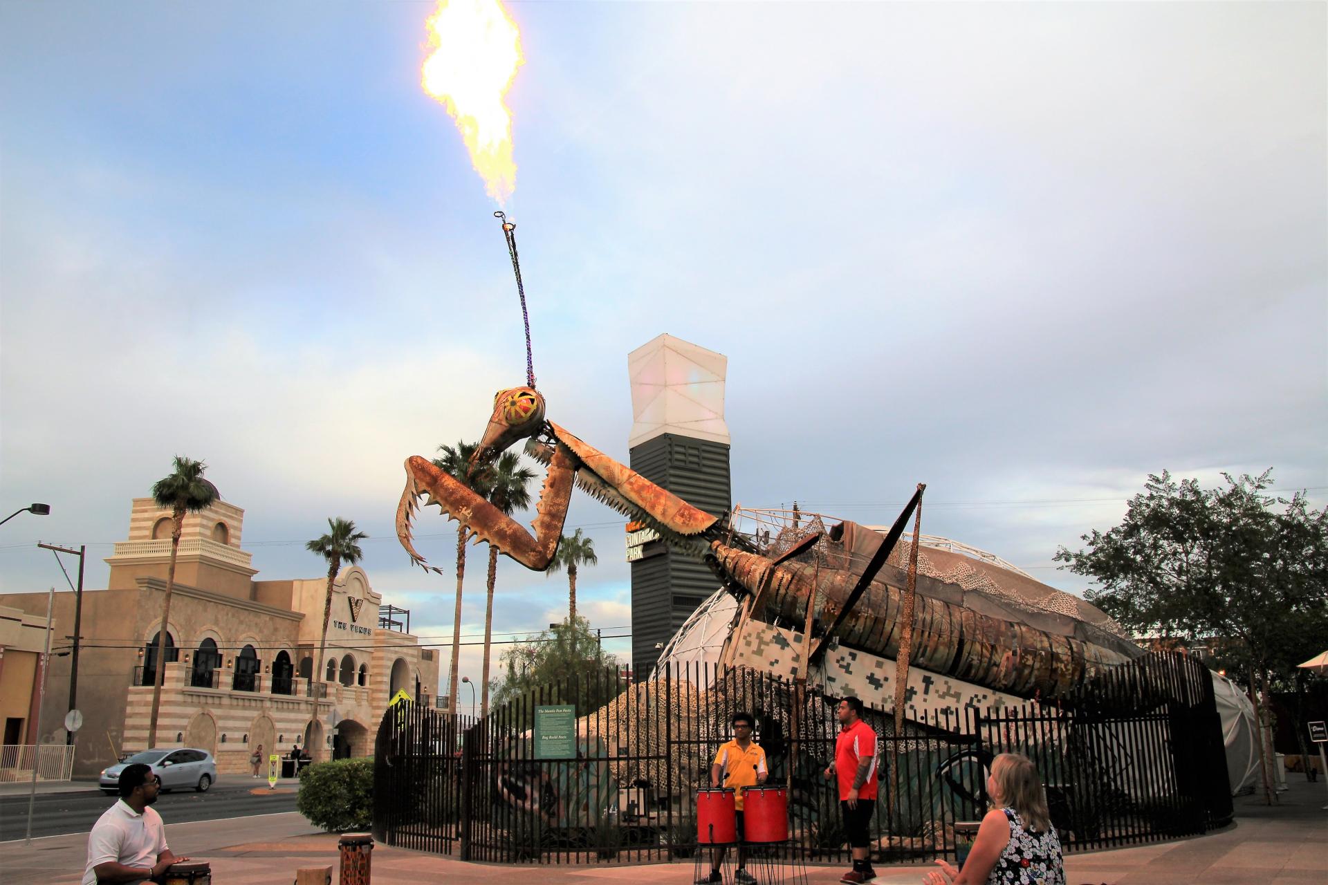 Mike steht schon wieder bei zwei Hostessen und quatscht sie voll. Wir sind weiter gelaufen und stehen nun direkt vor der Heuschrecke. Gladys kommt und meint in 10 Minuten geht eine Show los. Wir setzen und auf die Stufen und warten. Die Show beginnt mit einer wilden Trommelei und die Heuschrecke spukt im Takt Feuer. Das geht so ca. 10 Minuten und endet mit einem Staccato. Während der Trommler bereits zusammenpackt spuckt die Heuschrecke weiter Feuer zu einer wilden Musik.