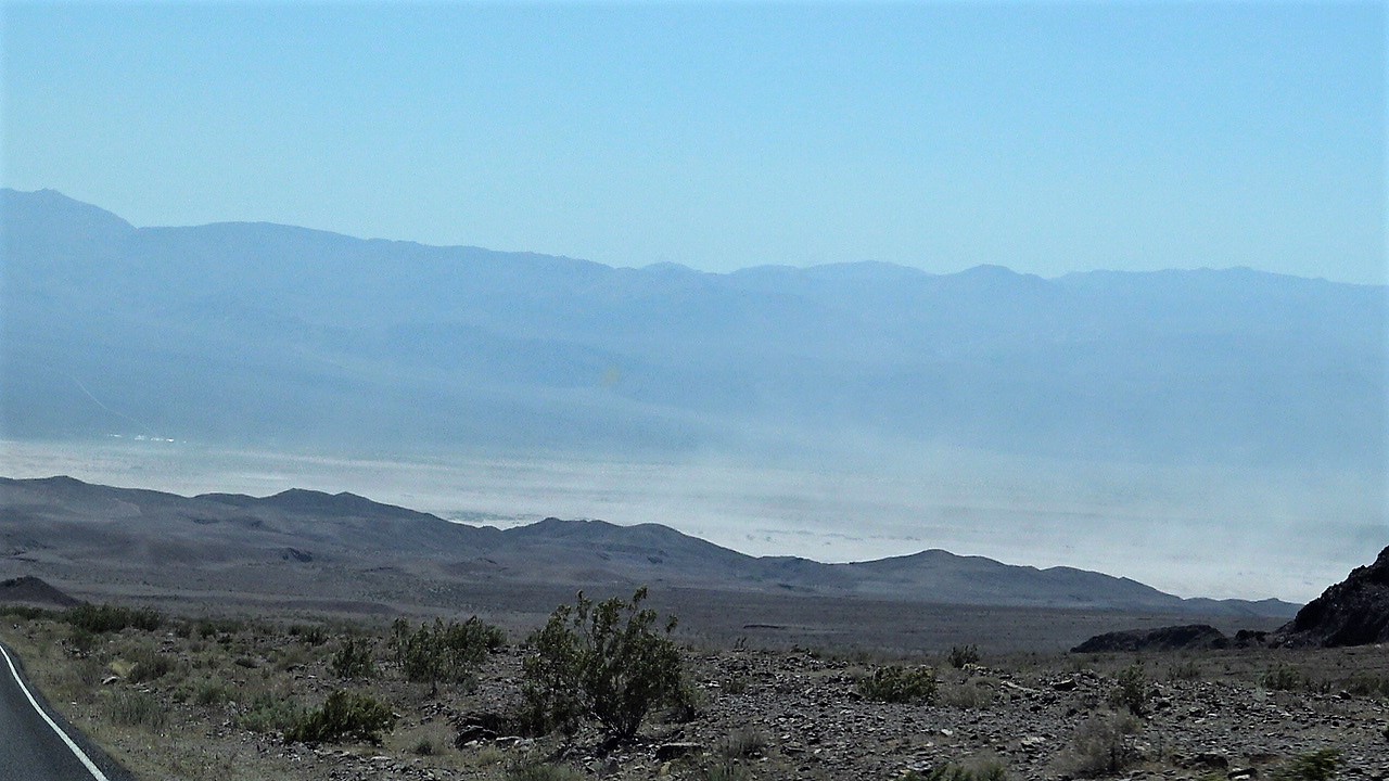 Nun geht es Richtung Death Valley immer bergab. Die Landschaft ist wieder sehr interessant. Am Eingangsschild des Parks wird angehalten und fotografiert. Wir müssen wieder „frech“ hinter dem Schild vorsehen, dass sind seine Lieblingsmotive. Dann geht es hinab ins Tal und Mike fährt an unserem Lieblingsaussichtspunkt vorbei, was uns erst einmal ärgert. Aber wir denken, dass wir vielleicht später mit dem Jeep noch einmal hierher kommen.