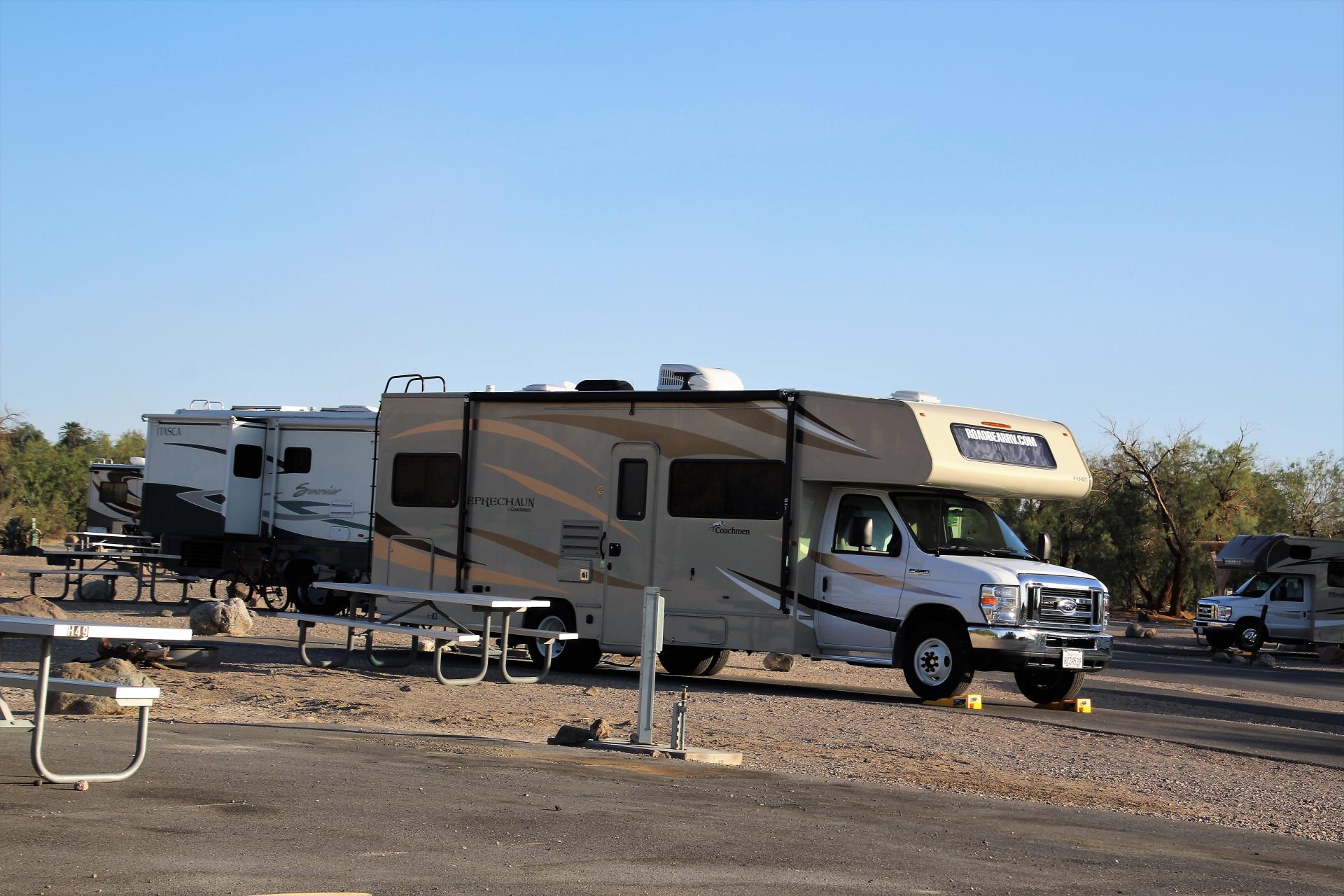 Der nächste Stopp ist das Visitor Center, wo wir bereits gegen 10 Uhr sind. Gladys und Mike sind sauer, dass der von ihnen bevorzugte Platz geschlossen ist. Ich vermute mal dass es der Sunset CG war, denn hier stand ein Schild „closed“. Nun fahren wir erst mal zum Furnace Creek CG, der gleich neben dem VC liegt. Mike fragt uns, ob wir full-huck-up wollen. Wir sagen ihm, dass wir das möchten wegen der Klimaanlage, denn es ist mittlerweile furchtbar heiß. Wir suchen uns einen Platz, der nicht reserviert ist. Die Beiden suchen sich zuerst einen anderen Platz ohne Strom. Nach einiger Zeit bekommen sie wahrscheinlich mit, wie heiß es ist und kommen doch noch zu den Komfortplätzen. Wir schließen alles an und stellen fest, dass es bereits 38°C sind.