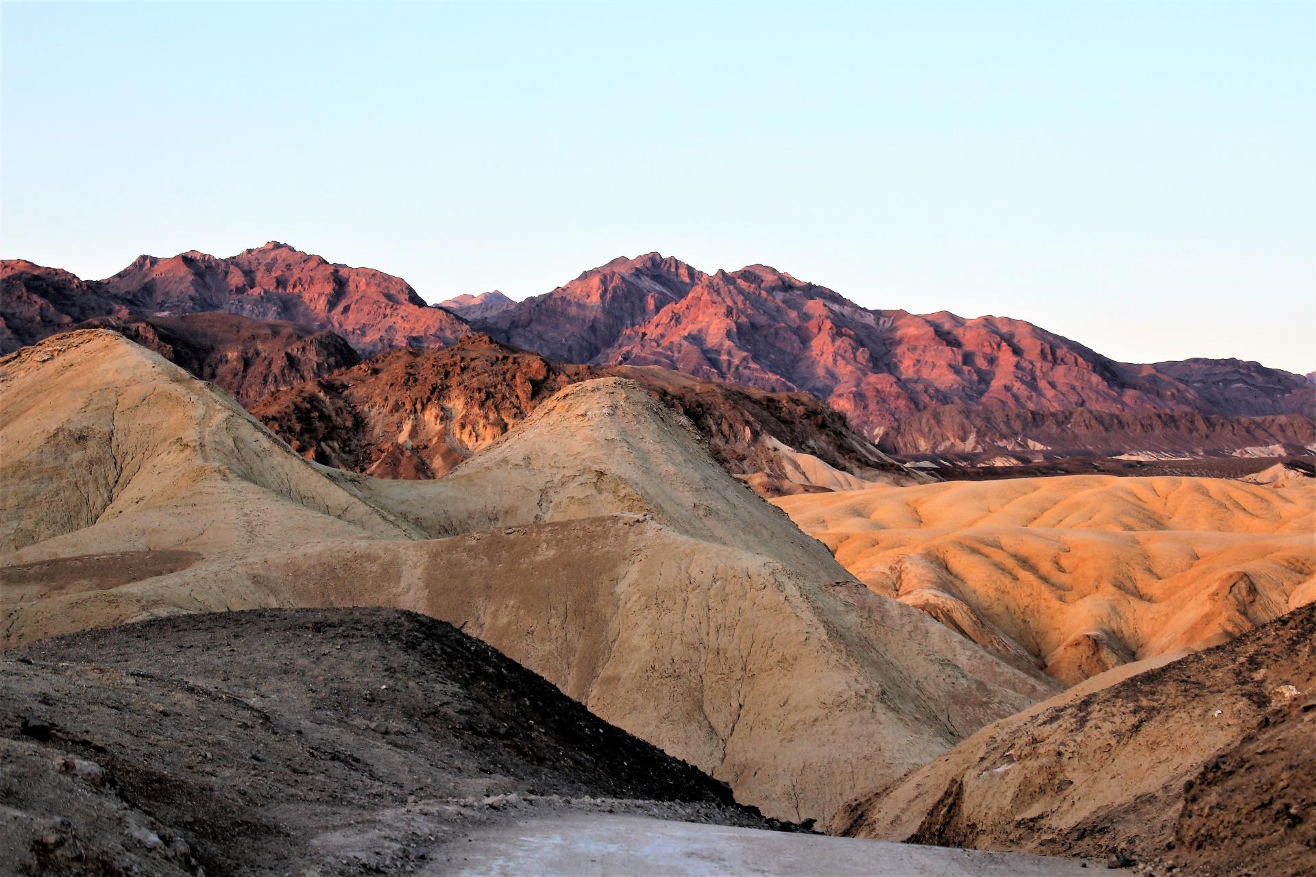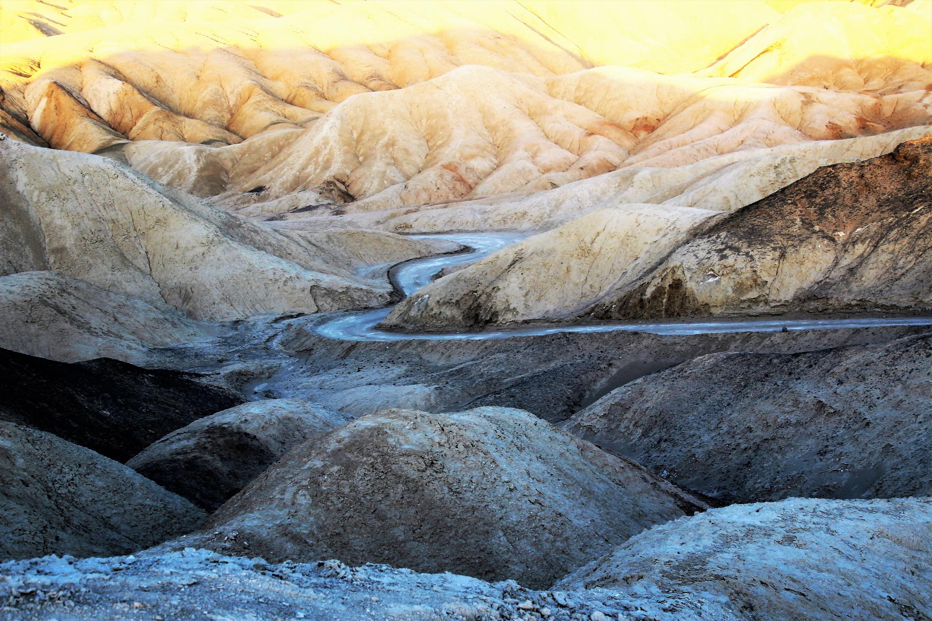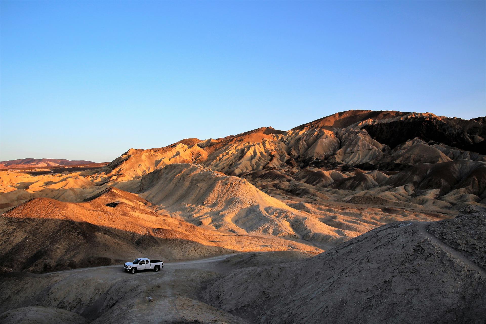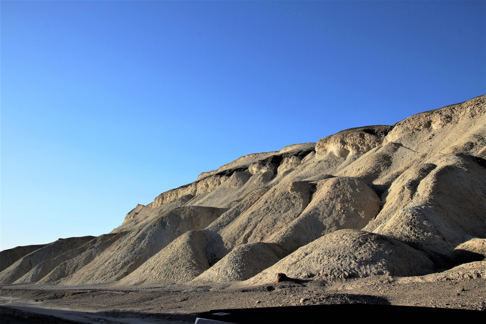 Um 18 Uhr fahren wir los in Richtung Zabriskie Point. Gladys sagt Mike wieder, wie er fahren muss. Leider fährt er wieder daran vorbei. Ich frage ihn, ob wir nicht mal hier anhalten können, aber ich bekomme nur ein „nein“ zu hören. Kurz dahinter biegt er ab in den Twenty Mule Team Drive. Diese Strecke ist wirklich nur für Jeeps geeignet, Wohnmobile dürfen hier nicht fahren. Es ist eine unbefestigte One Way Strecke. Nun eröffnet sich uns eine grandiose Landschaft mit den unterschiedlichsten Farben und Steinformationen. Wir machen viele Stopps und die die untergehende Sonne taucht alles in ein wunderbares Licht.