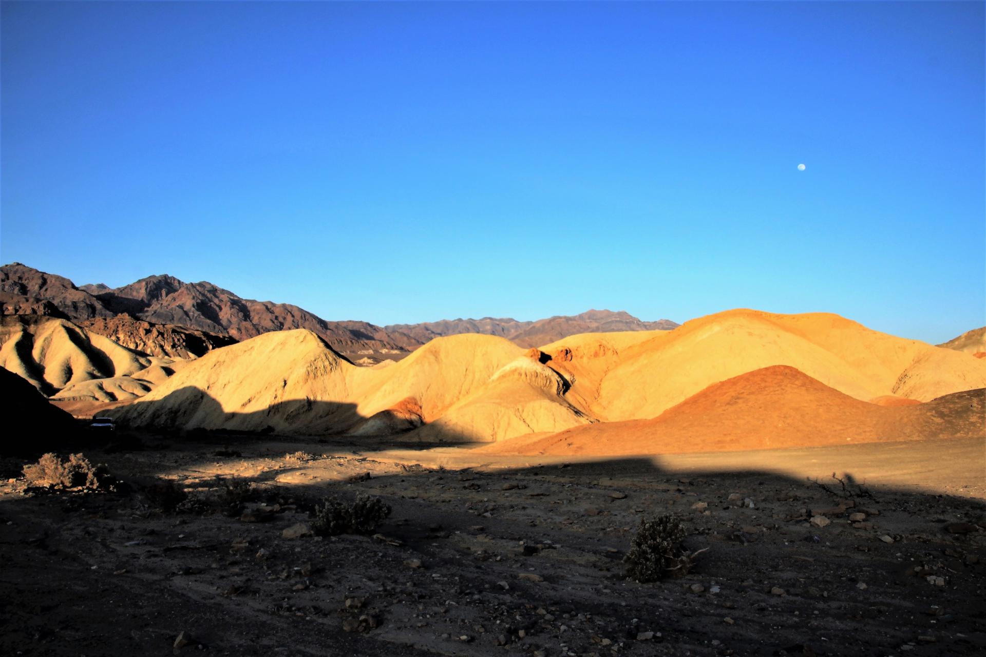 Dann geht die Fahrt weiter durch den Canyon. An einer anderen Stelle halten wir an. Mike und Norbert klettern auf einen Hügel, den ich nur zur Hälfte erklimme. Es geht ein sehr starker Wind und Norbert setzt sich oben hin, damit er nicht weggewedelt wird. Langsam geht nun die Sonne unter und taucht die Berge in rötliche Farben. Im Osten ist bereits der Vollmond zu sehen. Als die Sonne hinter den Bergen verschwunden ist, fahren wir den Drive bis zum Ende weiter.
