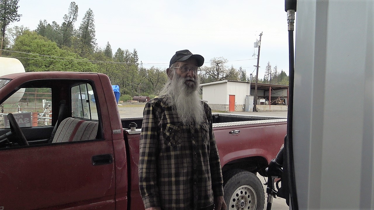 In Hayfork, einer Kleinstadt mitten zwischen den Bergen, tanken wir. Neben uns hält ein schrottreifes Auto und ein ebenso alter Mann mit langem Bart steigt aus. Da wir wahrscheinlich die Exoten in dieser Ecke sind, spricht er uns gleich. Ich verstehe ihn kaum, da er sehr nuschelt. Aber Norbert unterhält sich einigermaßen mit ihm und darf ihn sogar fotografieren. Nachdem der Tank voll ist, verabschiedet er sich. Unser Großer braucht ja etwas länger für eine Füllung.