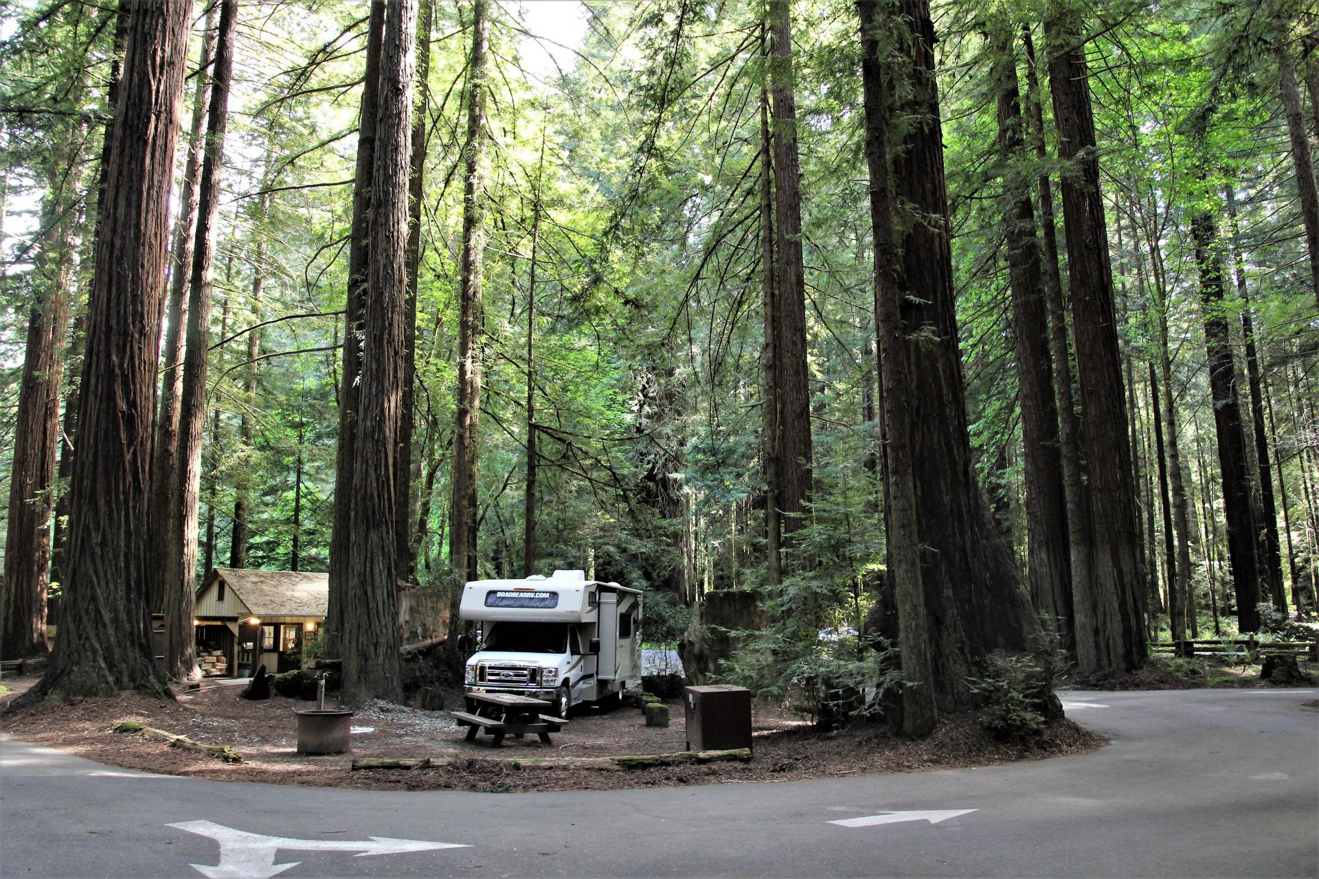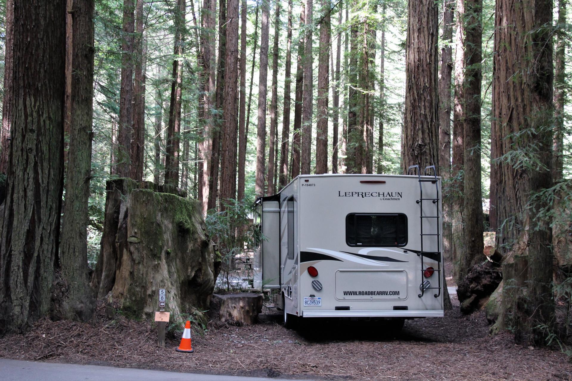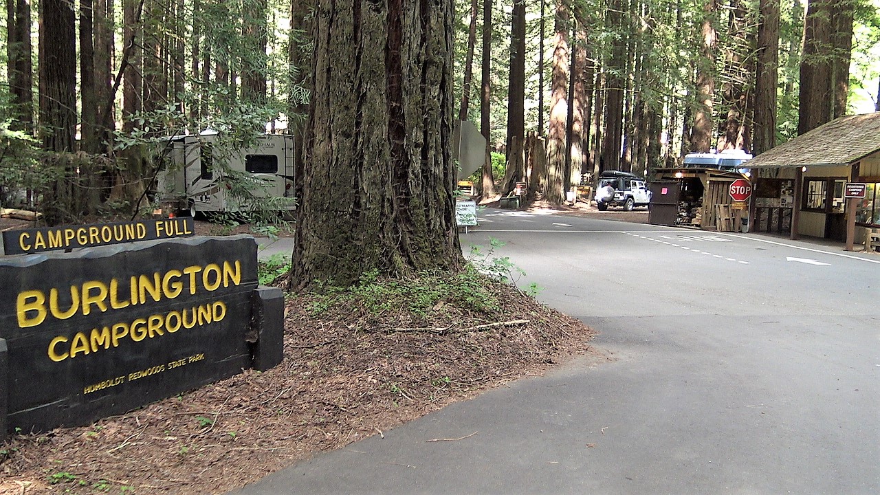 Wir erreichen den Campingplatz und es steht das Schild „Full“ am Eingang und wir haben nicht reserviert. Ich gehe aber trotzdem zur Rezeption, wo ich den Host anspreche. Er merkt wahrscheinlich an meiner Aussprache dass ich Deutsche bin. Er spricht mich jedenfalls in gutem Deutsch an. Ich frage ihn, ob es noch ein Plätzchen für uns gibt. Er hält Rücksprache mit der Rezeption und wir bekommen gleich den Platz neben dem Eingang. Er zeigt ihn uns und fragt, ob wir das Einparken schaffen. Wir nehmen den Platz und fahren rückwärts auf die Site. Norbert muss ganz schön jonglieren, damit er zwischen den riesigen Baumstümpfen durchkommt. Den Wasseranschluss können wir dadurch nicht nutzen, wir kommen aber dann morgen leichter wieder auf die Straße.