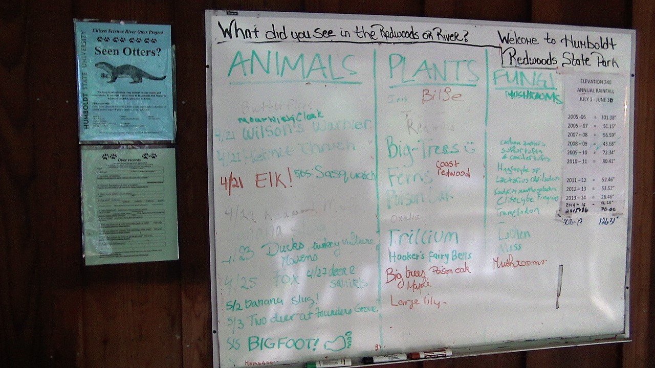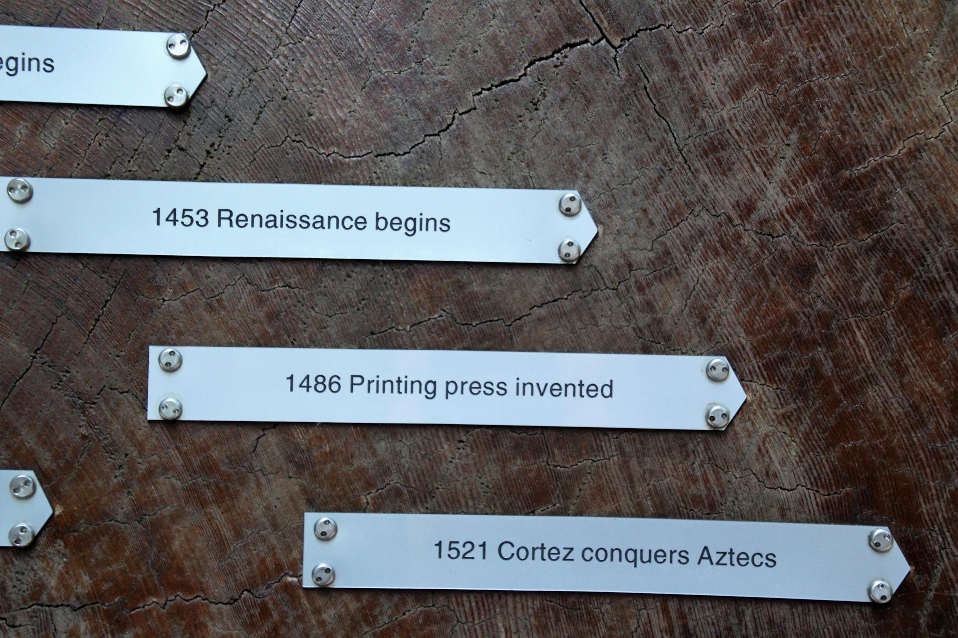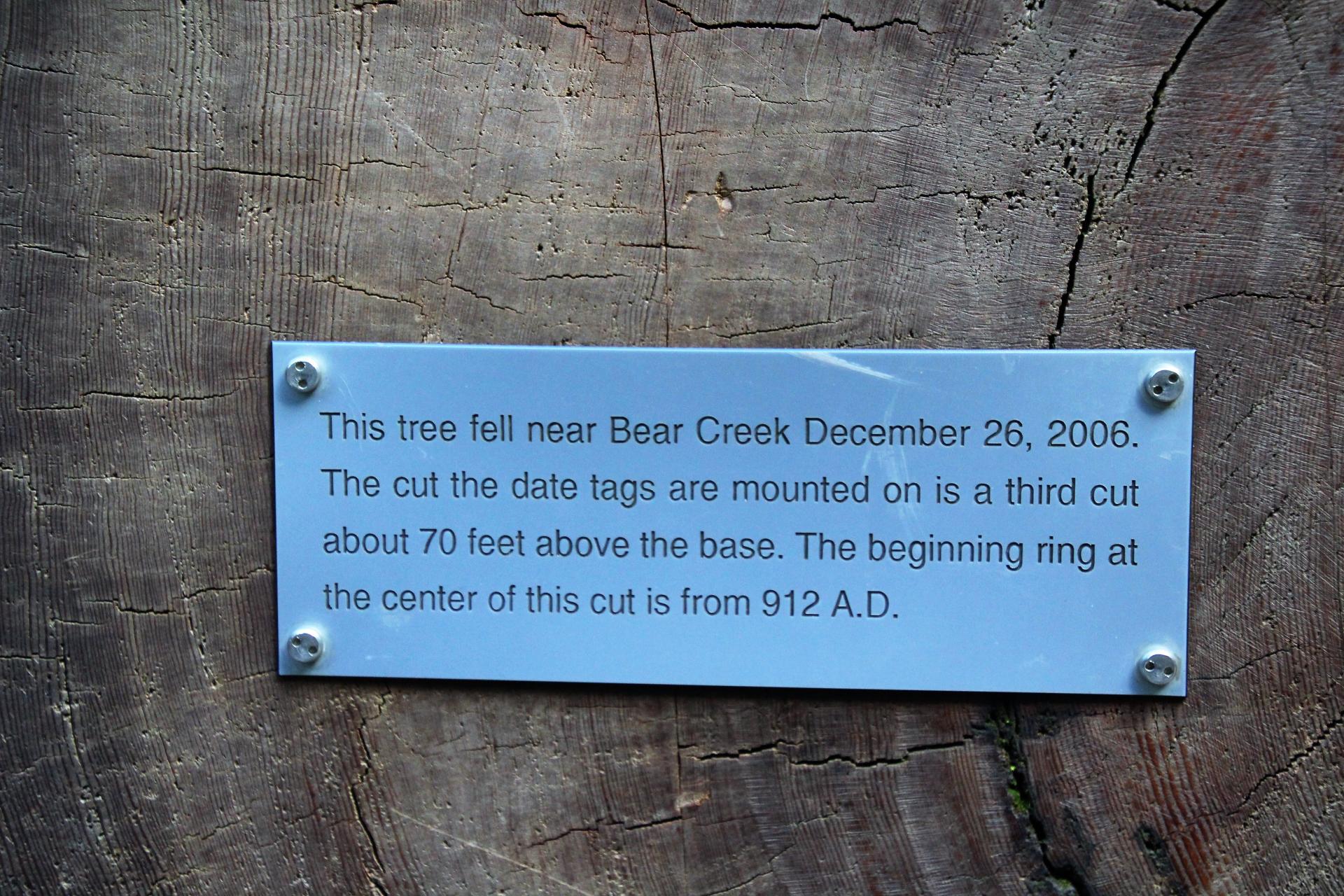 Es ist schon lustig, einen riesigen Baumstumpf direkt vor dem Fenster zu haben. Den Slide out können wir gerade noch ausziehen. Nach einer kurzen Pause machen wir  einen Rundgang. Zuerst gehen wir zum Visitor Center, das natürlich um diese Uhrzeit bereits geschlossen hat.  Die Außenanlagen sind sehr interessant. Auf einer Tafel sind aktuelle Tiersichtungen zu sehen, einen Bären haben wir leider verpasst. Ein Teil eines riesigen Baustumpfes ist zu sehen. Dieser Baum war über 1000 Jahre alt. Schilder sind an den Jahresringen angebracht und zeigen, welche  historischen Ereignisse zu dieser Zeit waren. Alles ist sehr interessant.