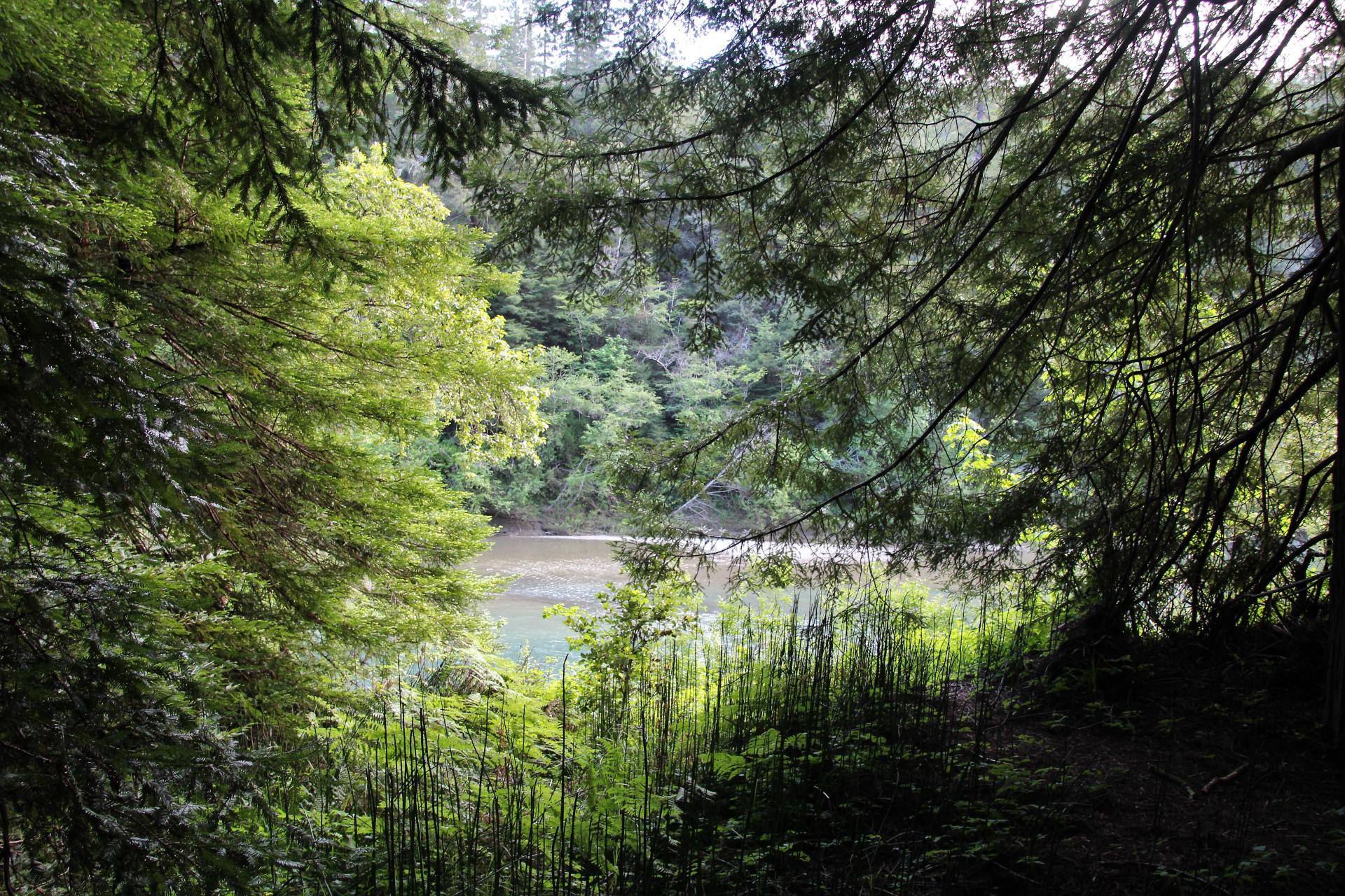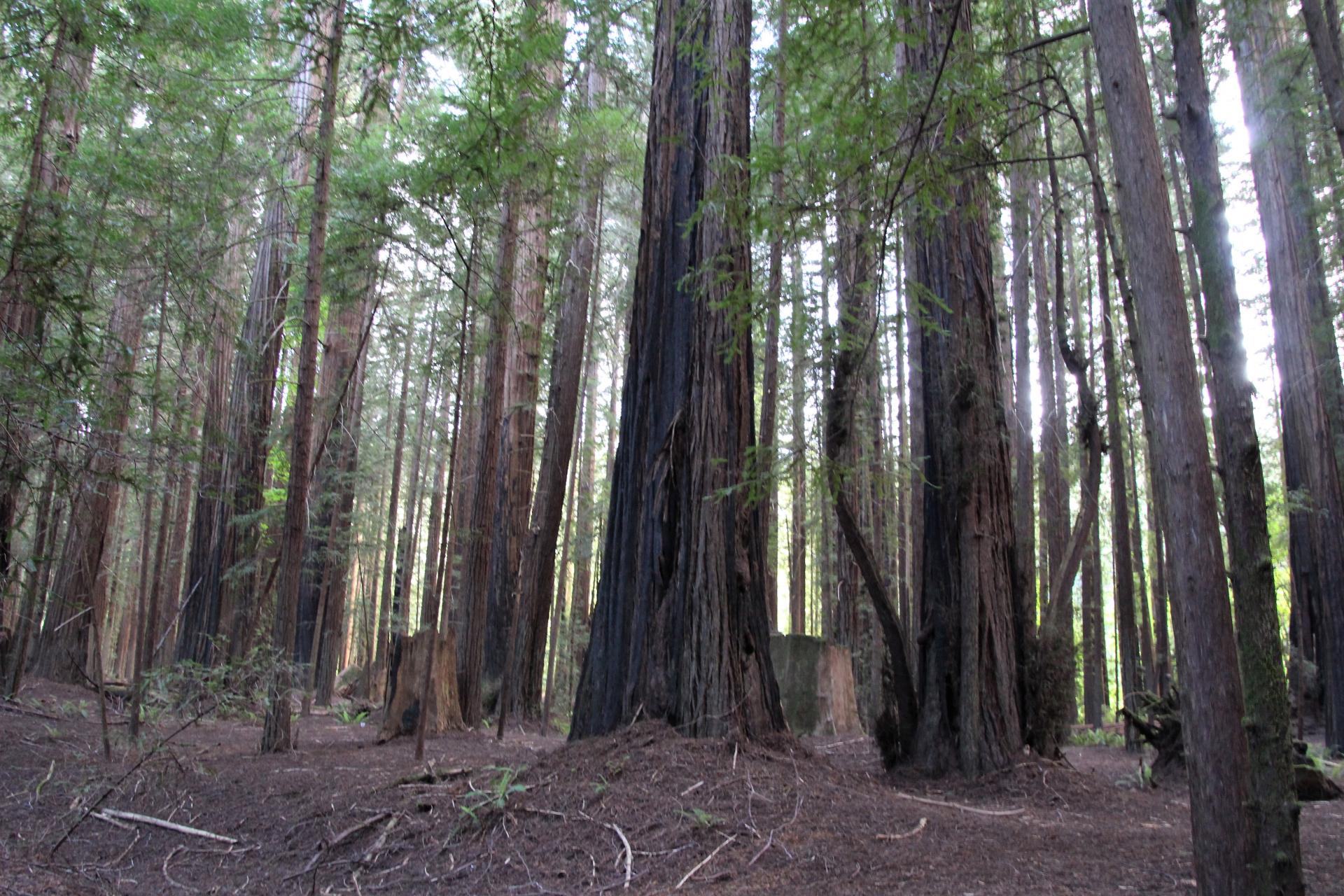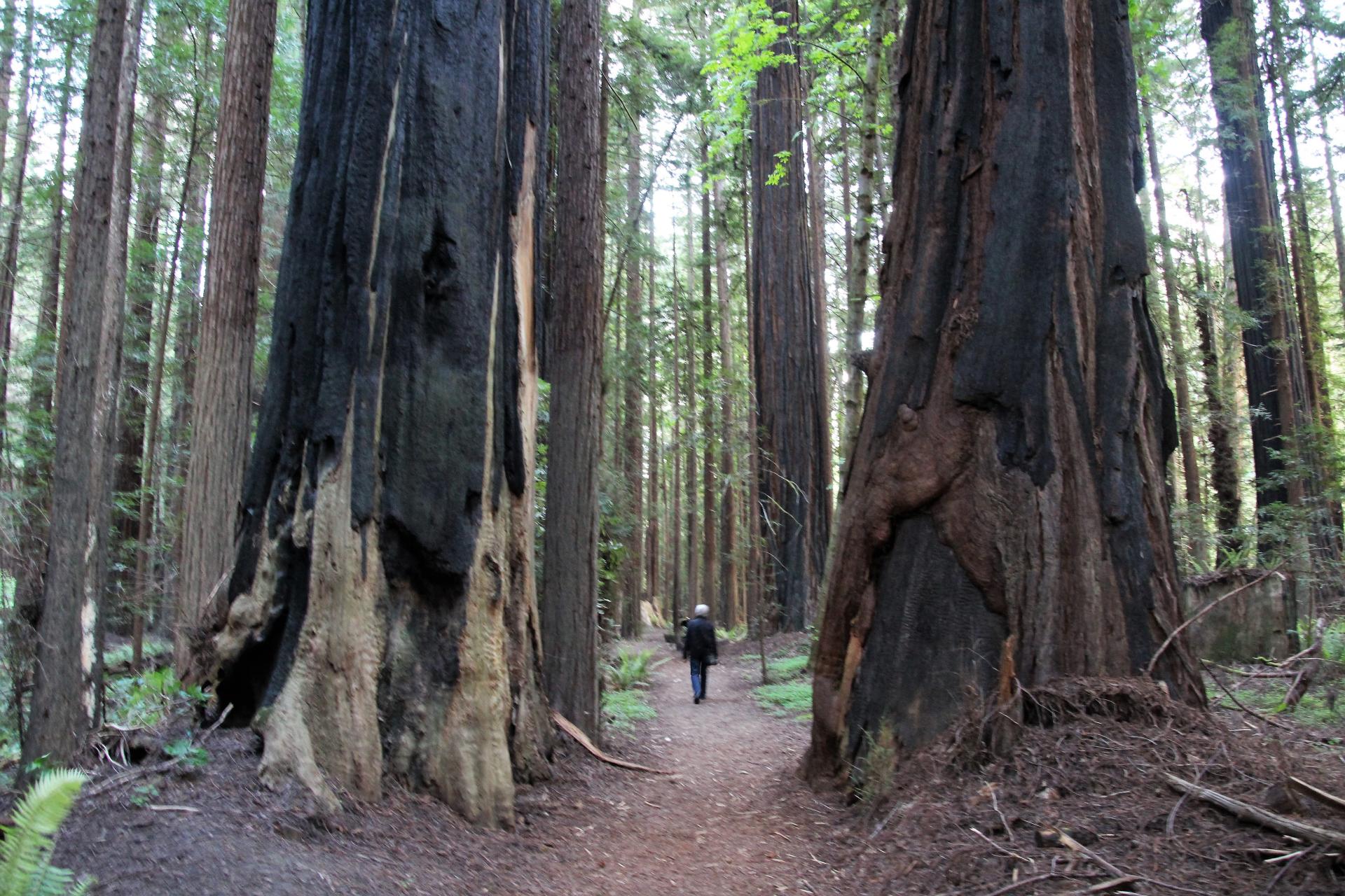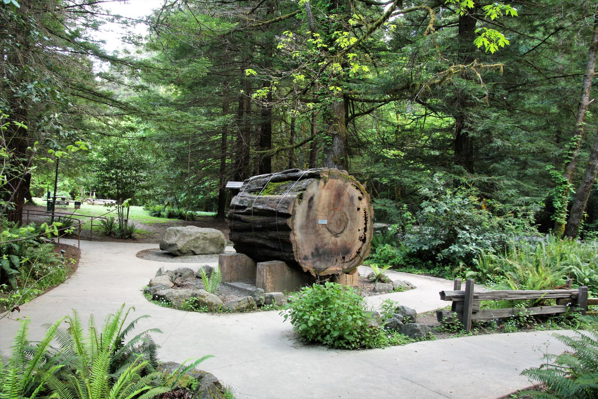 Nun gehen wir über die Straße und betreten den Wald mit vielen Redwoods. Ein Trail führt durch den Wald, an den riesigen Bäumen und Baumstümpfen vorbei. Es ist mächtig beeindruckend, solche Giganten zu sehen. Wir nehmen uns viel Zeit, setzen uns unterwegs mal auf eine Bank und genießen einfach nur die Ruhe und die herrliche Natur.