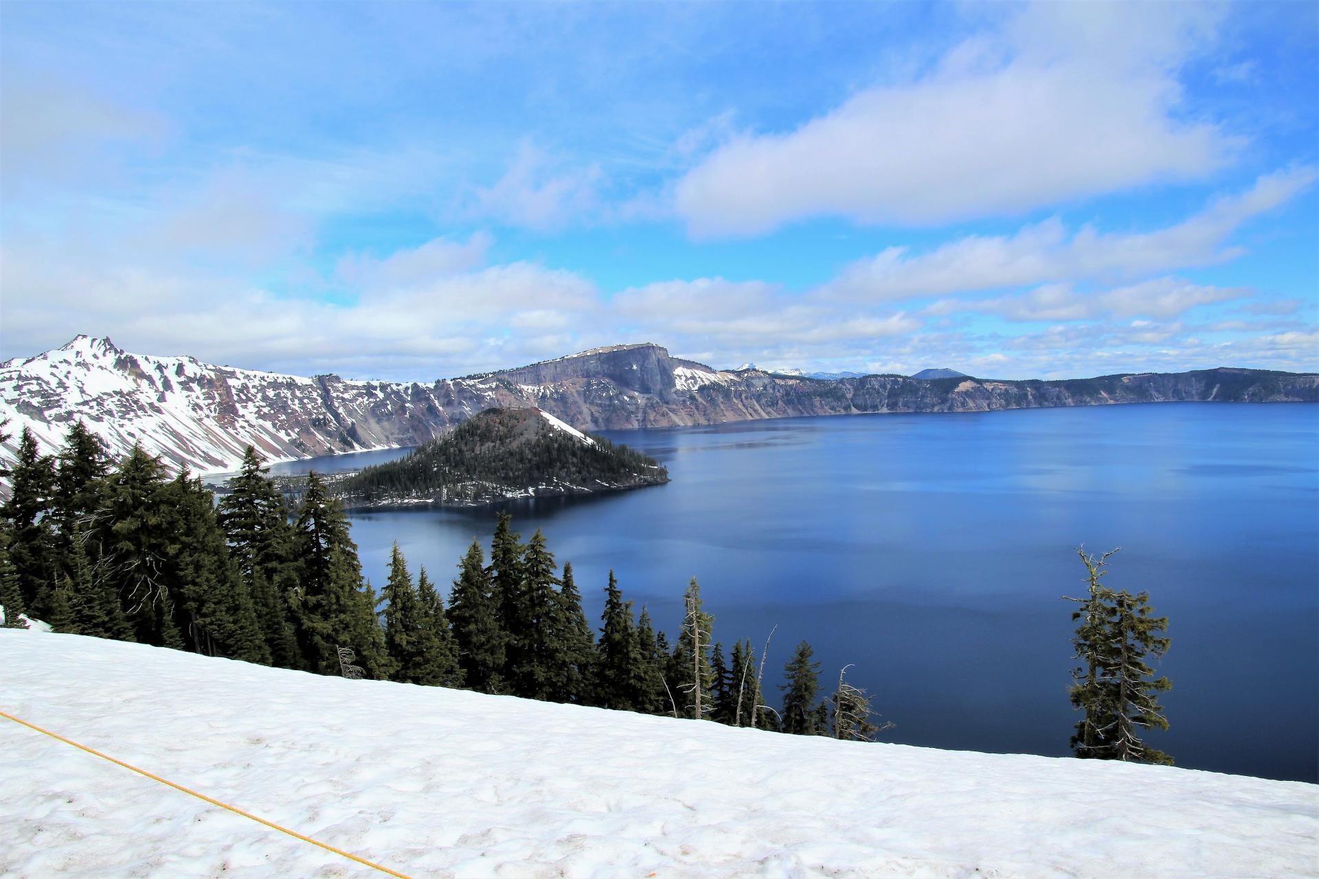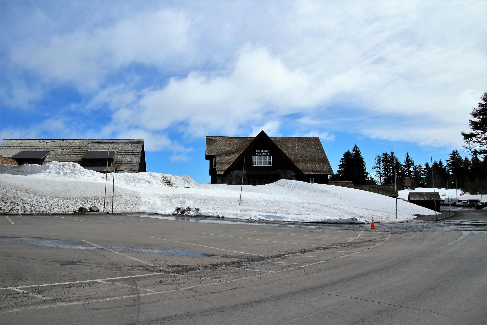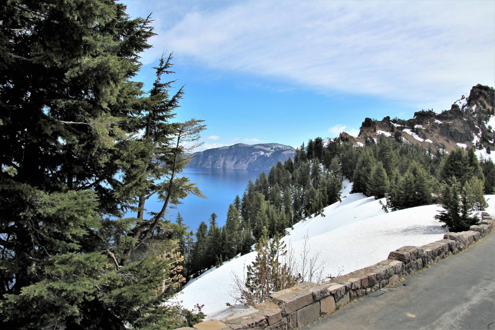 Wir kommen auf den Parkplatz am Crater Lake und an den Seiten liegt der Schnee teilweise noch zwei Meter hoch. Die Straßen sind aber frei. Wir sind gegen 10 Uhr da und es sind immerhin 9°C, also im Plusbereich. Nun werden erst mal die Wintersachen hervorgeholt und dann geht es los.