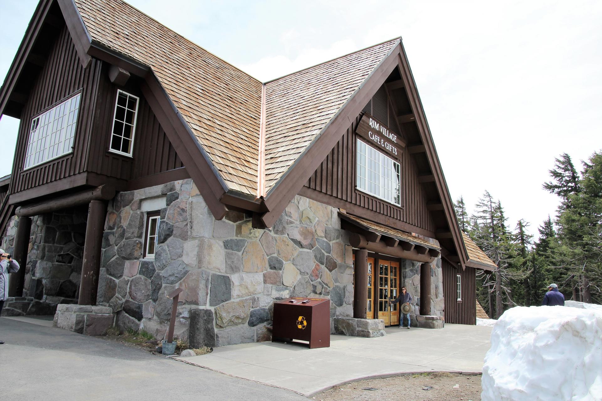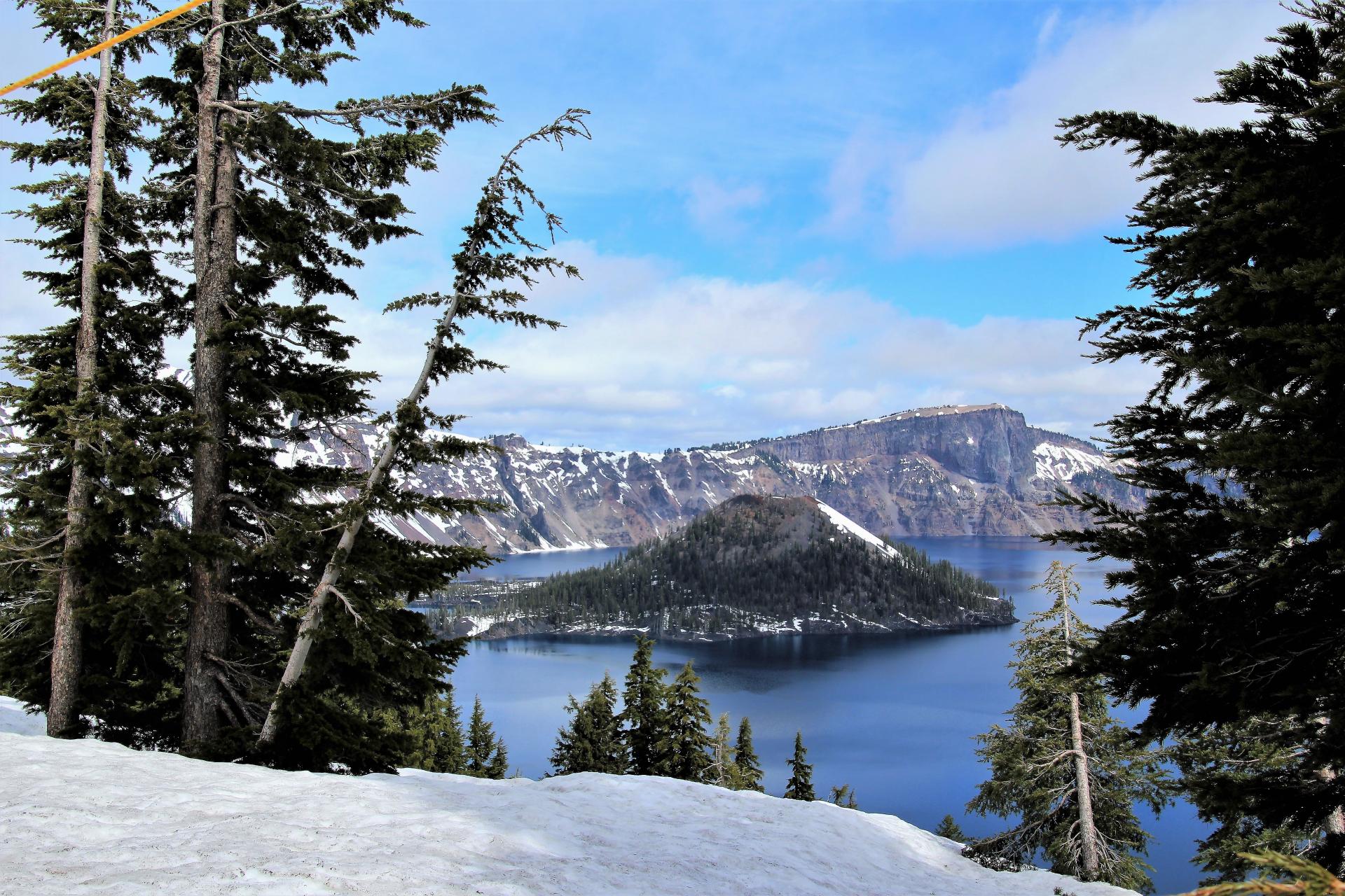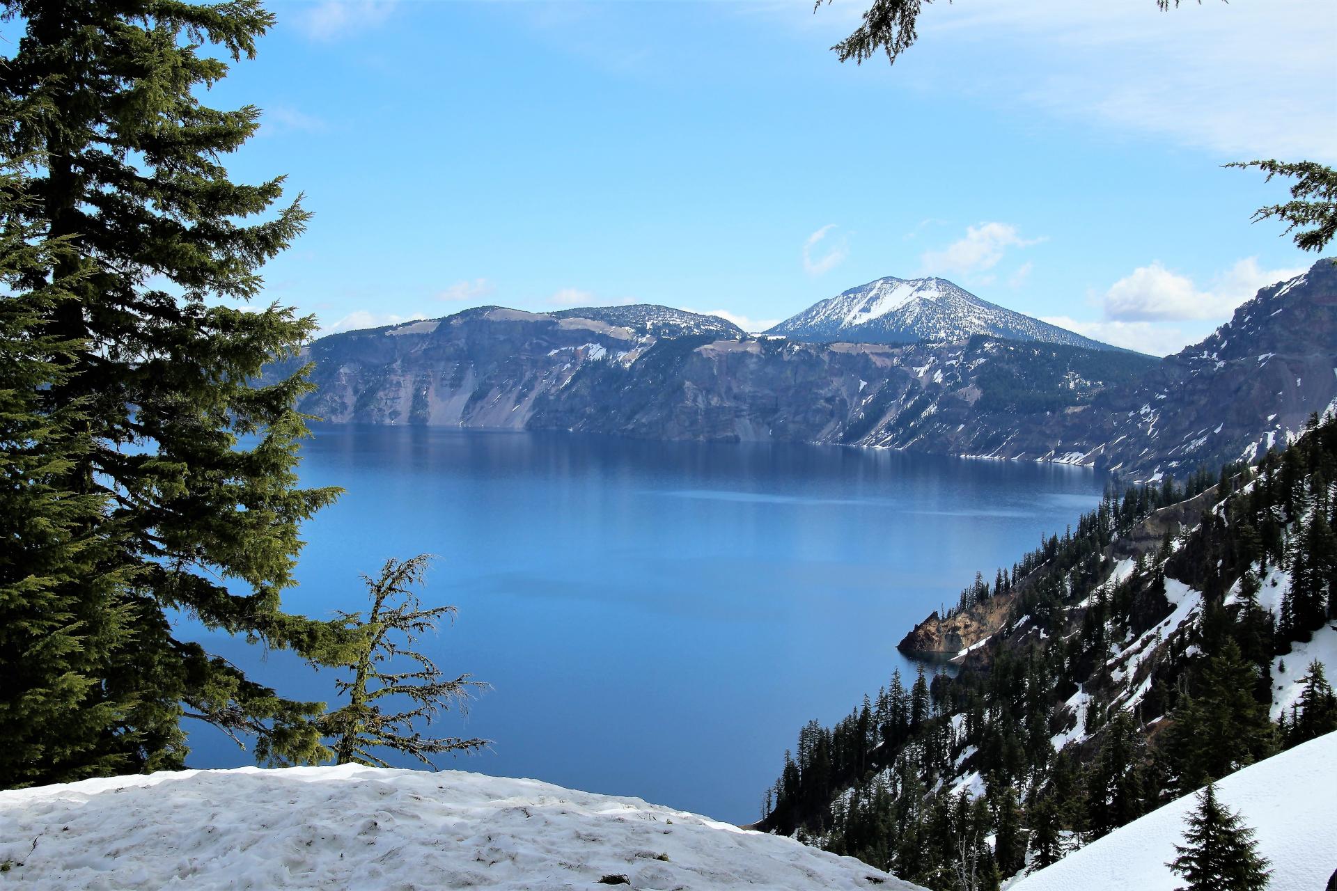 Wir kommen auf den Parkplatz am Crater Lake und an den Seiten liegt der Schnee teilweise noch zwei Meter hoch. Die Straßen sind aber frei. Wir sind gegen 10 Uhr da und es sind immerhin 9°C, also im Plusbereich. Nun werden erst mal die Wintersachen hervorgeholt und dann geht es los.