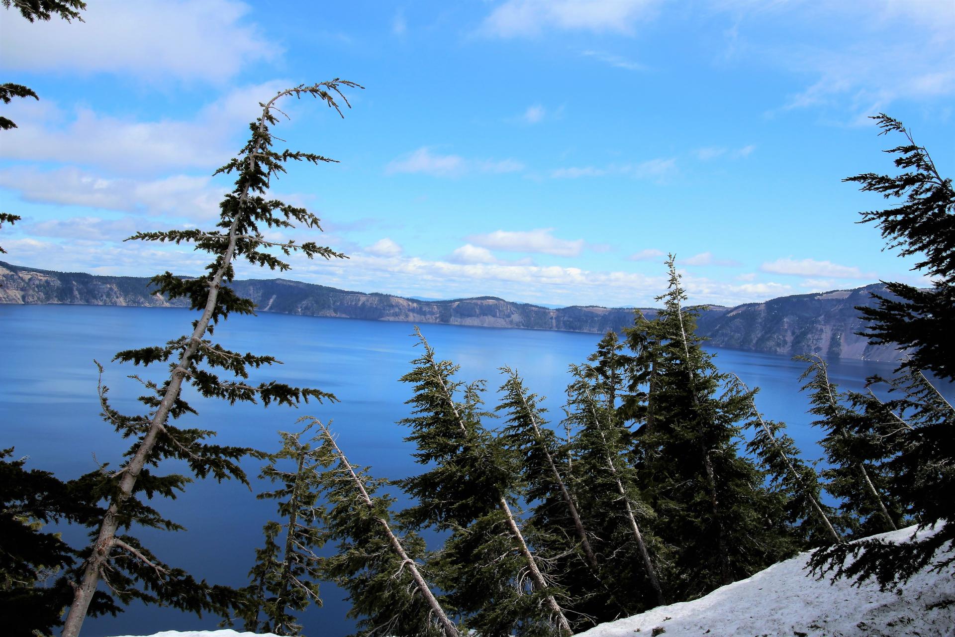 An einzelnen Stellen ist der Schnee geräumt, damit man zum Ufer kann. Teilweise steigen wir im wahrsten Sinne auf den Schnee hinauf, damit man einen schönen Blick hat. Was man sieht ist überwältigend. Der blaue See hebt sich wunderbar zu dem Schnee ab. Die grünen Tannen geben einen zusätzlichen Kontrast. Auch auf den Bergen ringsherum ist es noch weiß. Ich kann es kaum fassen, dass ich den schönen See nun doch noch zu Gesicht bekomme.