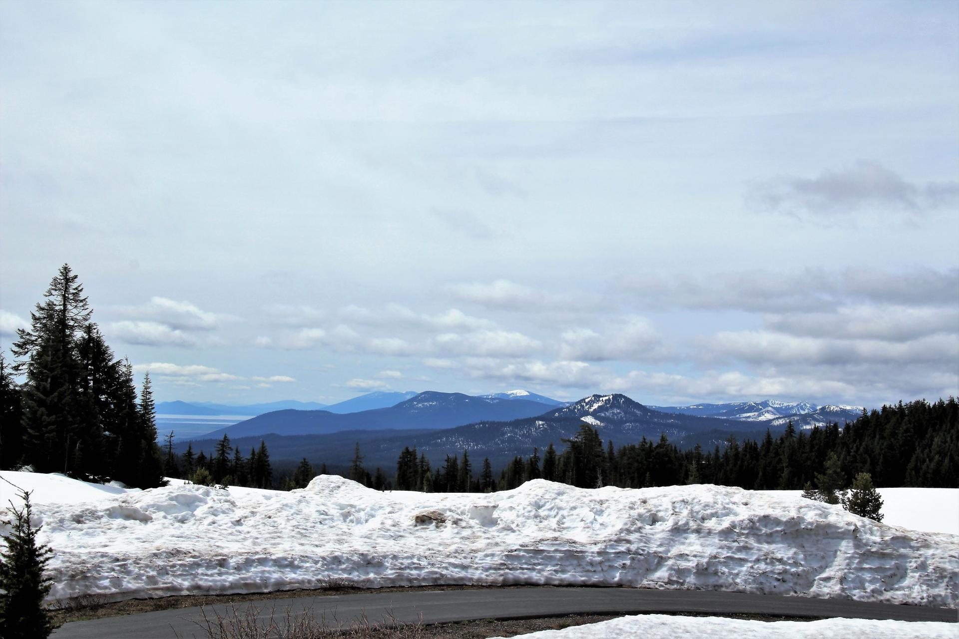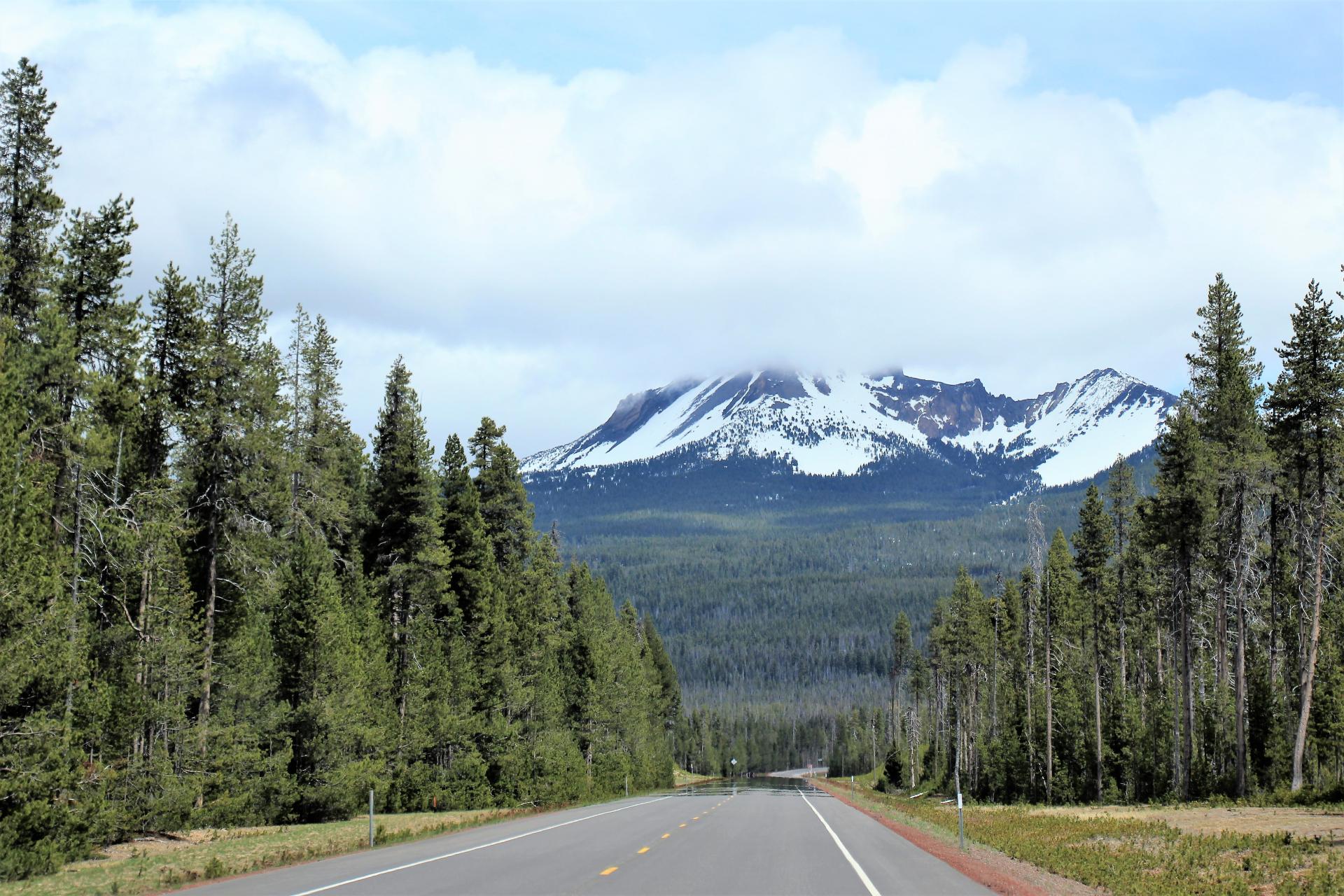 Da die Nordausfahrt noch gesperrt ist, nehmen wir den gleichen Weg zurück und fahren nun wieder wärmeren Temperaturen entgegen. Der Schnee an den Straßenseiten nimmt nach und nach wieder ab. Als Ziel hatte ich heute den Diamond Lake ausgesucht. Also fahren wir auf den Hwy 230 in Richtung Norden. Die Straße ist schnurgerade und wir sehen vor uns einen beeindruckenden Berg mit weißer Kuppe, der sich zum Teil in Nebel hüllt. Das müsste der Mount Thielsen mit einer Höhe von knapp 2.800 m sein.