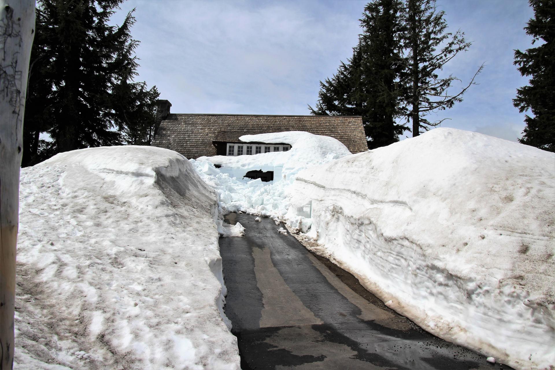 Je höher wir kommen, umso mehr wächst die Schneedecke an. Es kommen uns nur wenige Autos entgegen. Wir biegen ab und fahren in den Nationalpark. Die Station an der Einfahrt ist noch nicht besetzt. Da wir den Jahrespass haben, machen wir uns deshalb keine Sorgen. Der Schnee an beiden Seiten der Straße wird immer höher. Das Visitor Center ist bereits geöffnet. Da aber auch hier noch viel Schnee liegt, sieht es mit Parkplätzen etwas knapp aus, deshalb fahren wir gleich weiter.