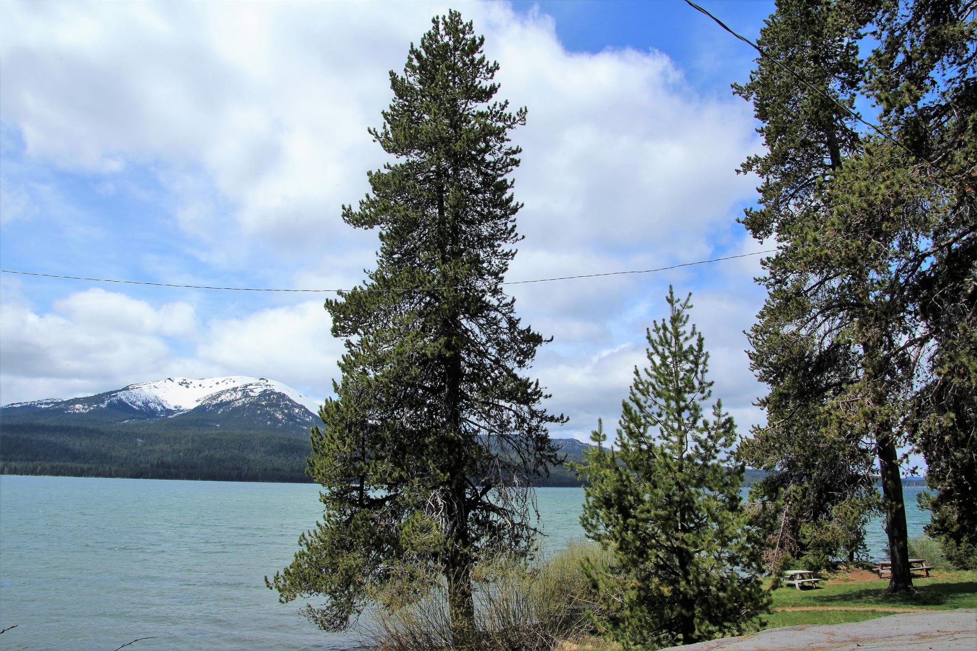Die Abfahrt zum Diamond Lake ist nicht weit und diese führt am See entlang. Fast am Ende ist der Campingplatz, den ich ausgesucht hatte. Als wir das Diamond Lake Resort erreichen, macht es auf uns erst einmal keinen so guten Eindruck. Es sieht alles etwas unordentlich aus. Außerdem gibt es hier sehr viele Fliegen. Man sieht richtige Schwärme. Wir überlegen nur kurz und entschließen uns, weiter zu fahren. Es ist ja erst früher Nachmittag. Also geht es den Weg zurück und wir machen einen kurzen Stopp an einem Zugang zum See. Der See liegt in einer schönen Landschaft und ist von Bergen umgeben. Nach einigen Fotos fahren wir weiter. Das Einsteigen ist nicht so leicht, denn auch hier gibt es Massen an Fliegen. Trotzdem wir sehr schnell ins Auto steigen, kommt ein Schwall Fliegen mit und wir machen erst einmal Jagd auf sie. Es sieht aus, als wenn das Eintagsfliegen sind.