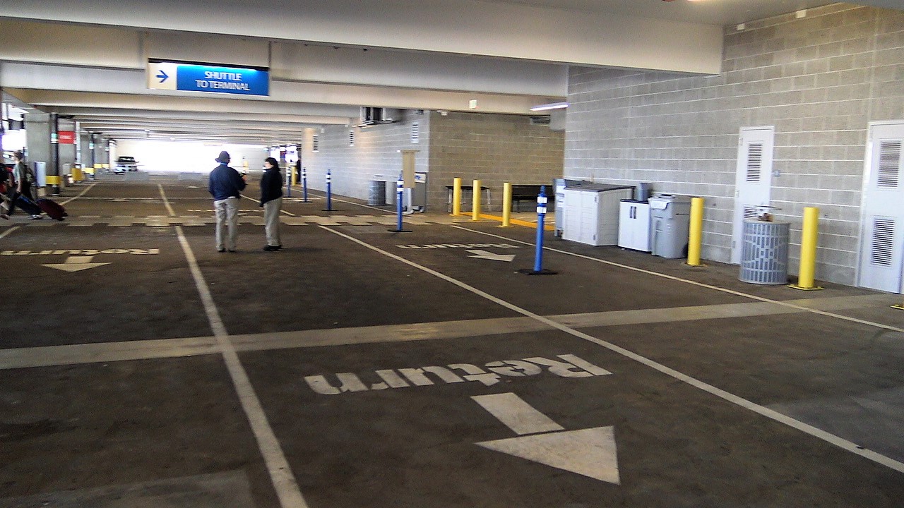 Dann laufen wir fast durch das ganze Parkhaus und folgen den Schildern zum Shuttle. Wir haben Glück und kommen gleich mit. Der Fahrer schnappt sich unsere Koffer und verstaut sie gleich. Die Fahrt ist kostenlos. Schon geht es los und nach ca. 10 Minuten sind wir am Terminal.
