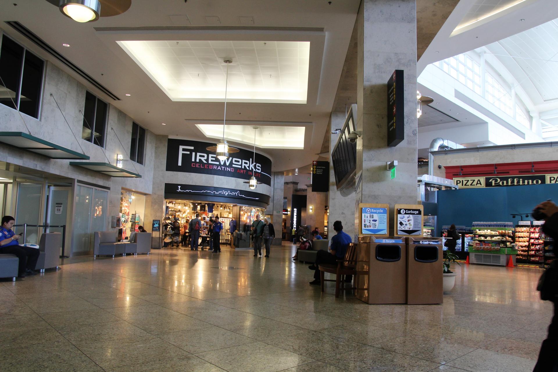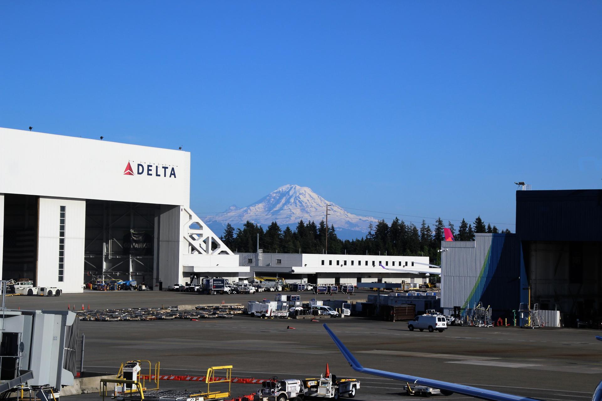 Danach gehen wir durch die Sicherheitskontrolle. Der Beamte ist zum Scherzen aufgelegt und hat nichts zu beanstanden. Wir laufen dann langsam zu dem Gate, die Wege sind recht weit. Hier suchen wir uns einen schönen Fensterplatz und beobachten den Flugverkehr. Auf der anderen Seite des Gates können wir noch einmal Abschied vom Mount Rainier nehmen. Er ist von hier aus in seiner ganzen Pracht zu sehen.