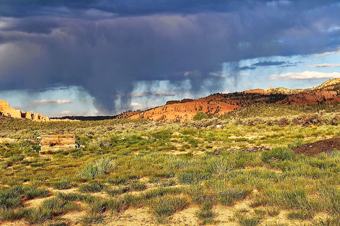 Eigentlich wollten wir auf dem Campingplatz im Red Rock Canyon übernachten. Da ich aber die Batterie von meinem neuen Fotoapparat aufladen muss, checken wir auf dem privaten RV-Park ein, der am Hwy 12 liegt. Wir werden freundlich begrüßt, bezahlen 31 $ für Full hook up und können uns den Platz aussuchen. Wir schließen an und packen erst mal unser Neuanschaffung aus. Während der Akku aufgeladen wird, beschäftigen wir uns mit der Funktionsweise. Jetzt am Nachmittag sind dunkle Wolken aufgezogen und es sieht stark nach Gewitter aus. Von hier sieht man in der Ferne schon die roten Felsen des Bryce Canyon Gebietes. Inzwischen ist die dunkle Wolkenfront weiter gezogen und hängt über den roten Bergen. Die Sonne scheint die Wolken an und es gibt einen schönen Kontrast. Diese Wetterstimmungen werden gleich für die ersten Aufnahmen genutzt.