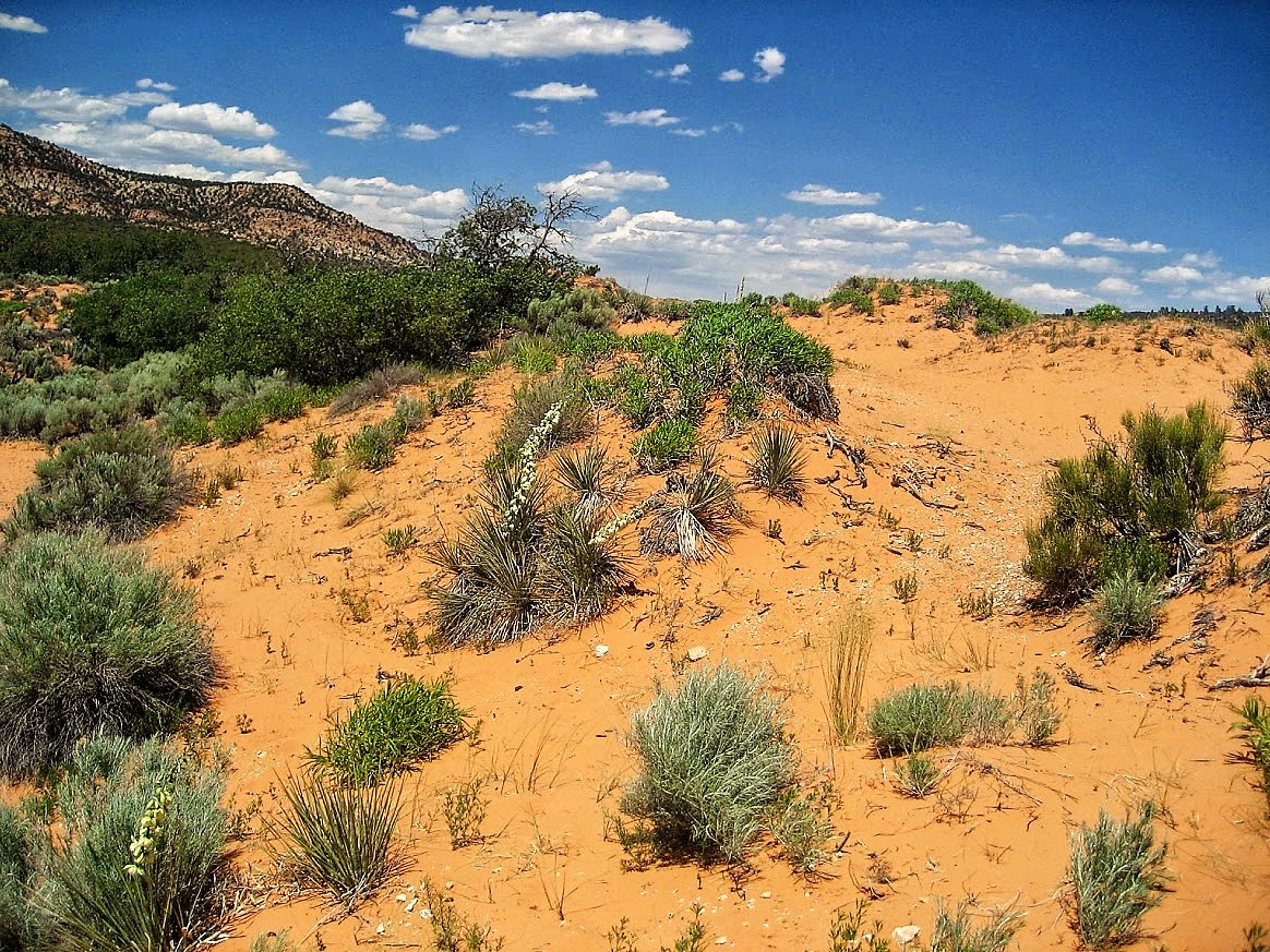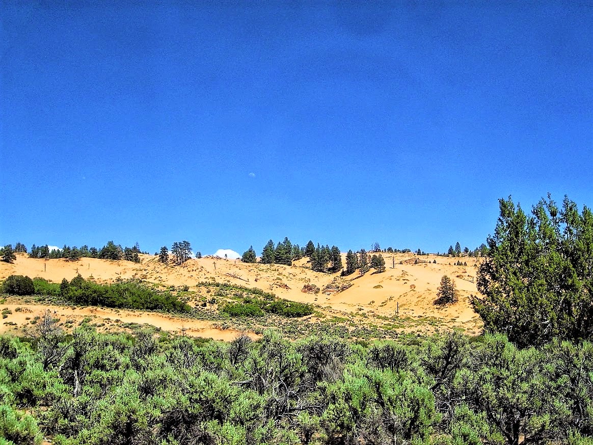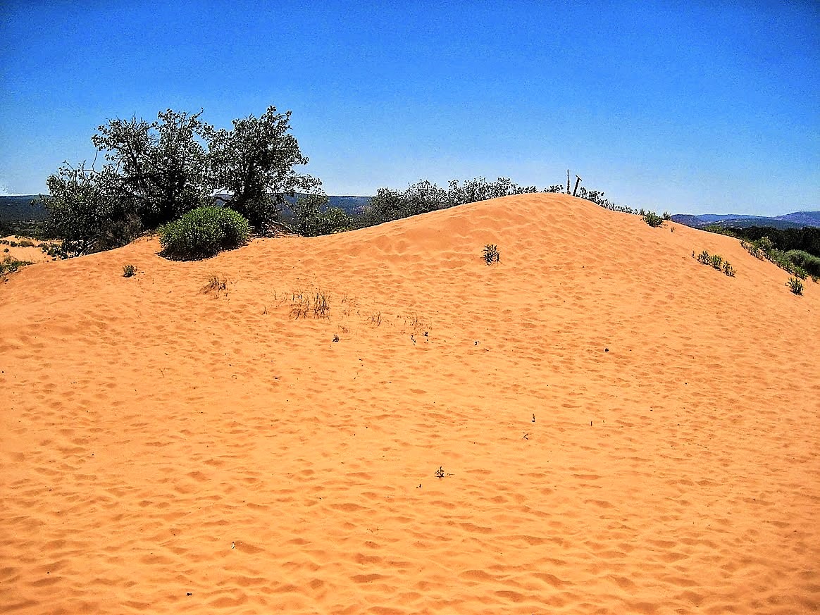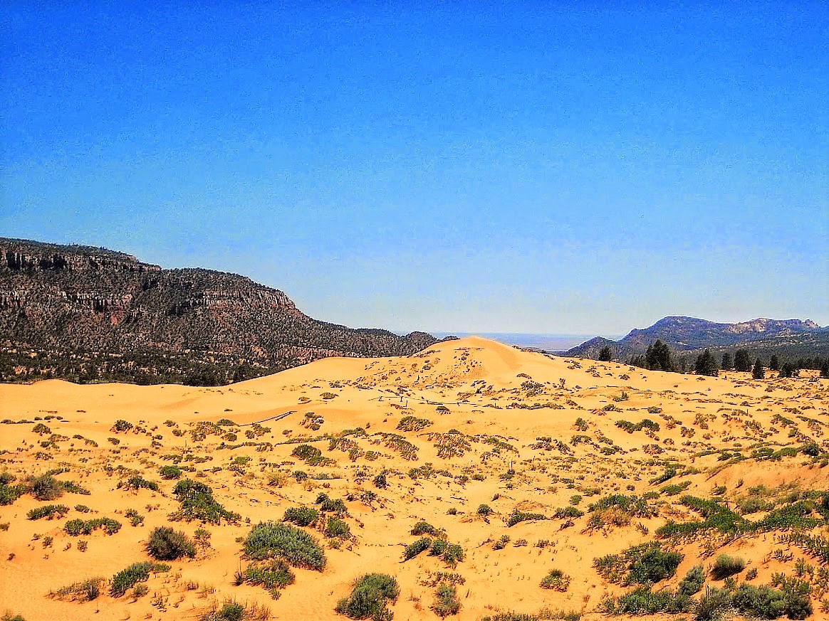 Hinter Kanab, einem hübschen Städtchen biegen wir zu den Coral Pink Sand Dunes ab. Wir machen eine Rast in dem State Park und schauen uns die beeindruckenden Dünen an. Die Farbe und das frische Grün bilden mit dem blauen Himmel einen herrlichen Kontrast.