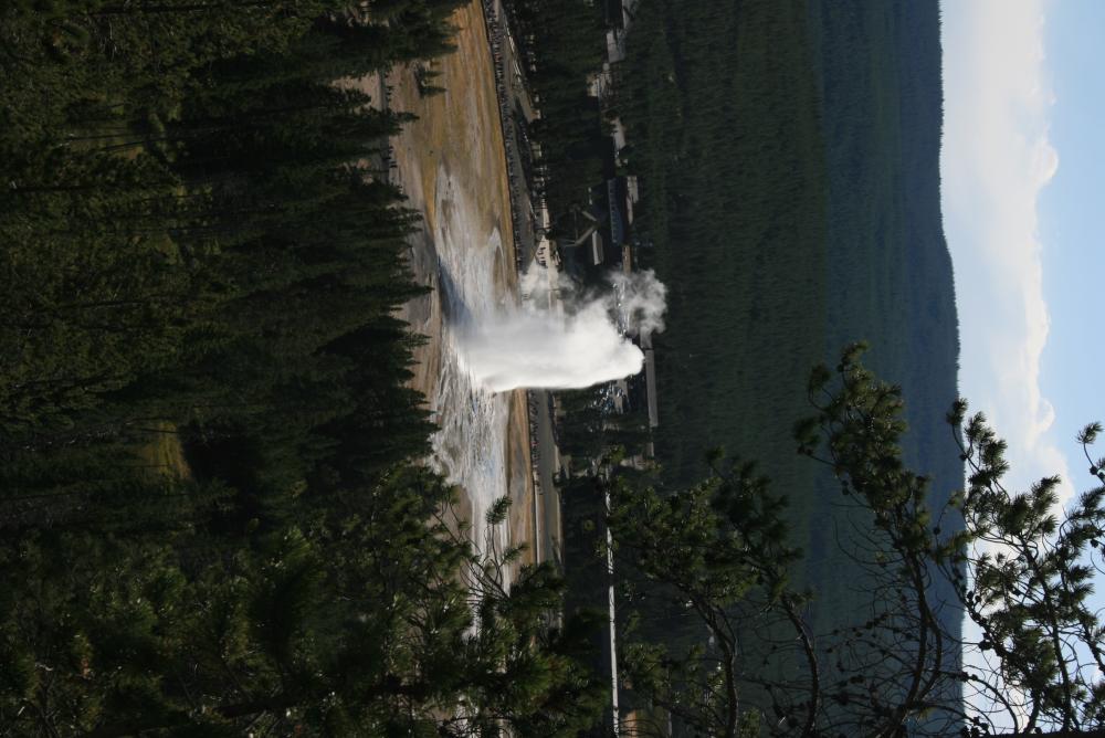 Der riesige Parkplatz war zu unserer Überraschung nicht voll. Im hinteren Teil konnten wir sogar wählen, wo wir unser Fahrzeug abstellen. Da der grosse Geysir sich kurz vorher ausgetobt hatte, entschieden wir uns, die Lodge und den Souvenir Shop zu besuchen. Der Magen knurrte mittlerweile und wir hatten noch genügend Zeit, uns einen Imbiss zu gönnen. Kurz vor dem nächsten Ausbruch fanden wir Plätze, um das Spektakel zu verfolgen. Beim anschliessenden Spaziergang durch das Basin sahen wir einen Abzweiger zum Solitair Geysir. Eine Touristin bemerkte unsere Unentschlossenheit und empfahl uns die kurze Wanderung hinauf. Sie hatte nicht zu viel versprochen. Der kleine Geysir zierte sich einwenig, bis er sich zeigte. Da wir schon auf halber Höhe waren und wir nicht denselben Weg zurück wollten, wanderten wir dem Wegweiser entlang zum Overlook des Old Faithful. Nach unserer Berechnung sollte die Zeit bis zum nächsten Ausbruch reichen, um oben anzukommen. Kaum am Ziel, suchten wir uns einen schönen Platz und dann war es bereits soweit. Auch von hier ein eindrückliches Erlebnis. Zufrieden kehrten wir zurück zum Wohnmobil und fuhren zum Grant Village, wo wir die nächste Nacht verbrachten.
