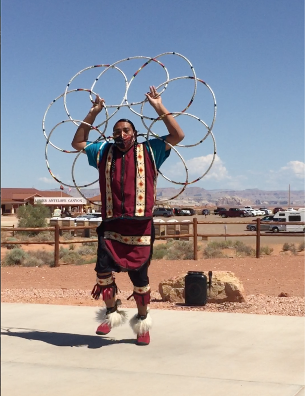 Im Wartebereich tanzt jetzt ein Hopi mit Reifen (Hoop-Dance), toll schaut das aus. Er sagt, er hätte schon mehrere Wettbewerbe gewonnen und zählt sie auf. Wir stehen noch 10 Minuten und schauen zu, dann fahren wir ab in Richtung Grand Canyon.