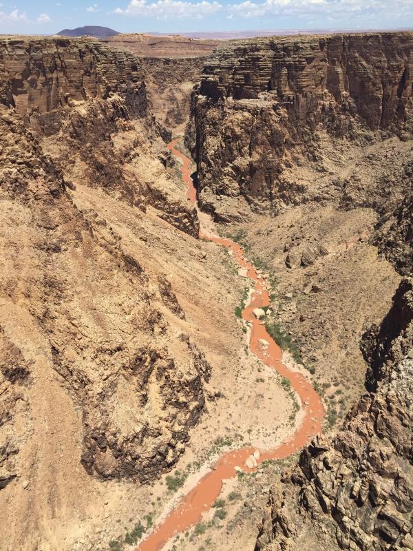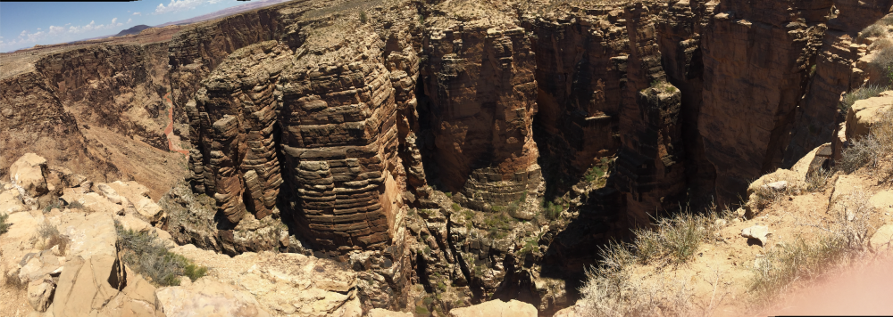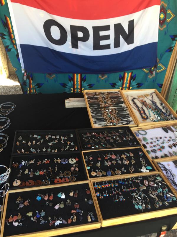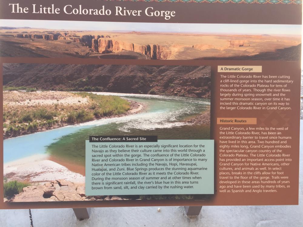 Als wir zum Little Colorado River Gorge Overlook kommen, bleiben wir stehen. Ich hatte hier im Forum gelesen, dass es einen kleinen Eintritt kostet, der die Indianer unterstützen würde. Die Schranke ist aber offen, überall stehen Schilder, die verkünden, dass der Ausblick gratis ist. Von den vielen Verkaufsständen, die es dort gibt, sind gerade mal ein Viertel besetzt. Insgesamt macht es einen eher traurigen Eindruck. Wir kaufen einige Armbänder, um zu helfen, dann bestaunen wir den Zusammenfluss des Little Colorado River mit dem Colorado River unten im Canyon, eine schöne Einstimmung auf das, was da noch kommt.