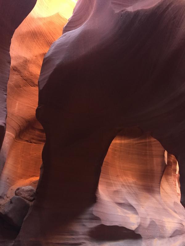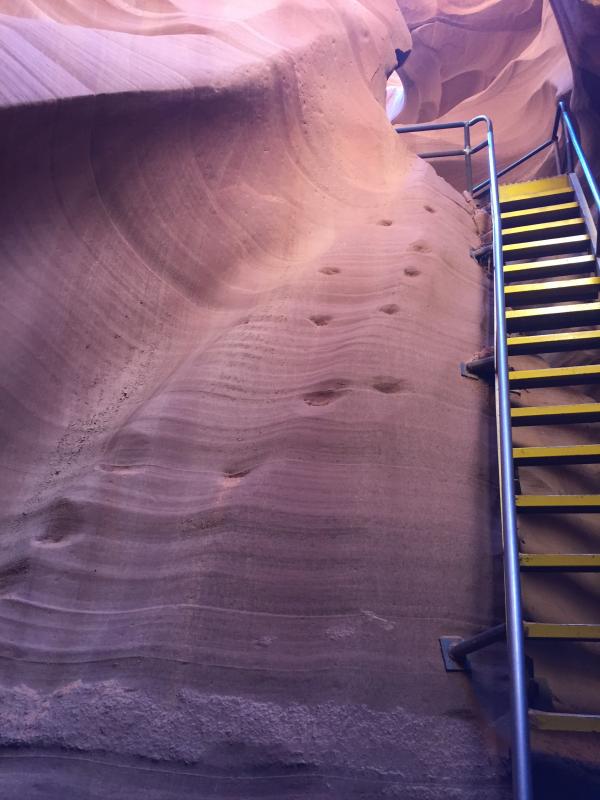 Der Canyon selbst ist der Hammer. Wir sind weit genug von den anderen Gruppen entfernt, wir sehen sie in dem engen Canyon fast nie. Auch haben wir viel Zeit, um alles anzuschauen, zu fotografieren, und ab und zu mit unserem guide zu sprechen. Er erzählt uns von seiner bevorstehenden Hochzeit und wie er sie nach Diné Tradition feiern wird. Sehr interessant! Als Kind hat er hier mit seinen Freunden gespielt, und zeigt uns die Moki Steps, die sie damals benutzt haben, Treppen gab es keine. Vor flashfloods hatten sie keine Angst, erwidert er auf meine Frage und erzählt dann von der Tragödie 1997, als 11 Touristen gestorben sind. Er zeigt uns, wo sich der indianische guide, der als einziger überlebt hat, damals festgeklammert hat. Jetzt wird bei schlechtem Wetter der Canyon vorsichtshalber geschlossen. Auch gestern sei der Canyon geschlossen gewesen. Ich wundere mich, denn gestern hat es nicht geregnet. Den Tag davor aber schon, erklärt er, und nach jedem Monsunregen, der Geröll und Dreck in den Canyon spüle, müsse er „aufgeräumt“ werden.